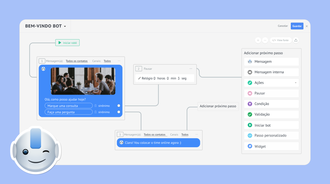 O chatbot da Kommo, também conhecido como Salesbot, interage, qualifica e encaminha leads instantaneamente para o agente certo, 24 horas por dia, 7 dias por semana, sem interrupções. Você pode configurar o chatbot sem precisar de nenhum conhecimento de programação e deixar que ele transforme cada consulta em uma oportunidade.