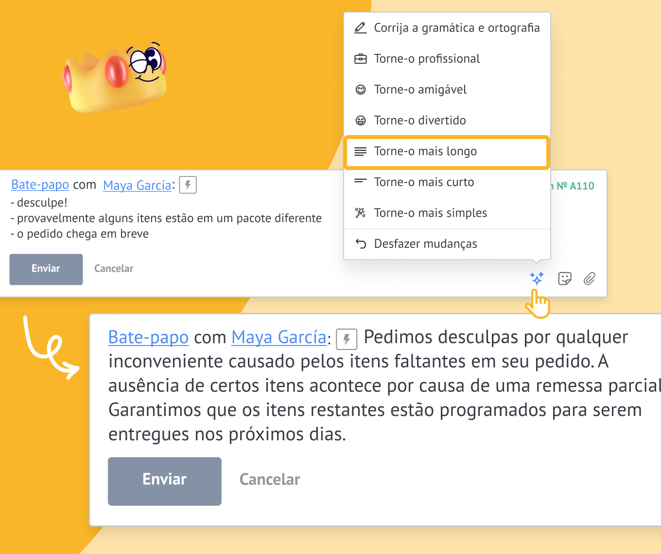 Cansado de pensar demais em cada mensagem? Conheça a Kommo IA - sua arma secreta para interações mais precisas, rápidas e significativas com os clientes. Com tecnologia de ponta, ela não apenas auxilia, como aprimora a sua comunicação.