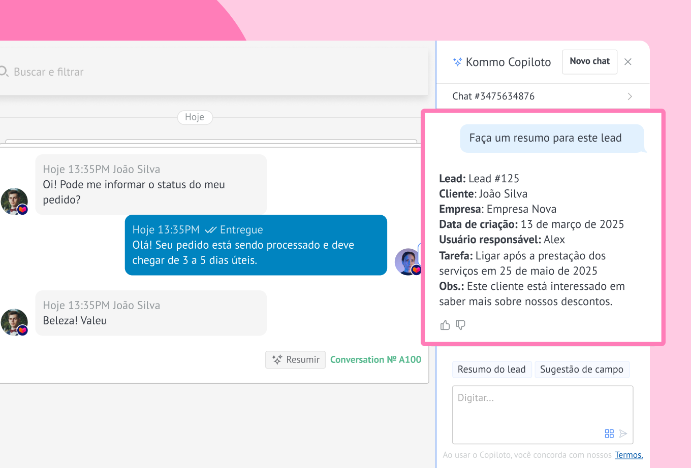 Novo na Kommo? O Copiloto facilita tudo. Pense nele como seu assistente pessoal de integração, pronto para responder a perguntas e orientar você nas próximas etapas enquanto aprende a usar o sistema com eficiência. É como ter um especialista da Kommo ao seu lado 24 horas por dia, 7 dias por semana, ajudando você a trabalhar de forma mais inteligente desde o primeiro dia.