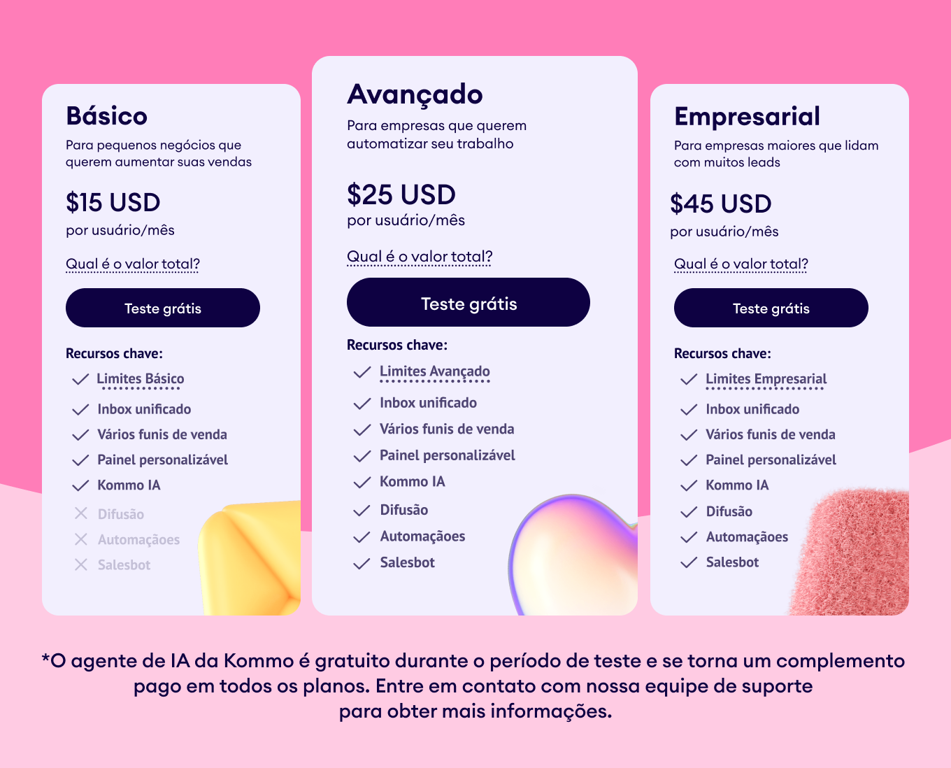 O preço da Kommo é dividido em três níveis: o plano Básico custa cerca de uS$ 15 por usuário/mês, o plano Avançado custa US$ 25 e o plano Empresarial custa US$ 45 — cada nível desbloqueia mais automação, recursos avançados e limites maiores para contatos e campos personalizados.