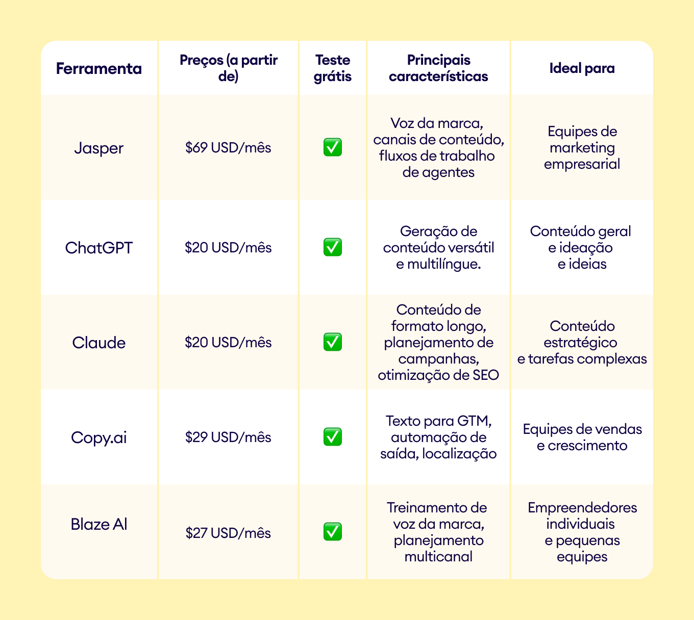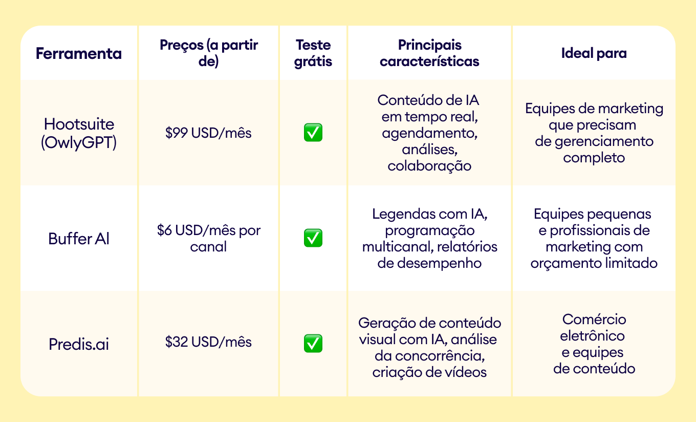 Tabela comparativa: Melhores ferramentas de marketing com IA para mídias sociais