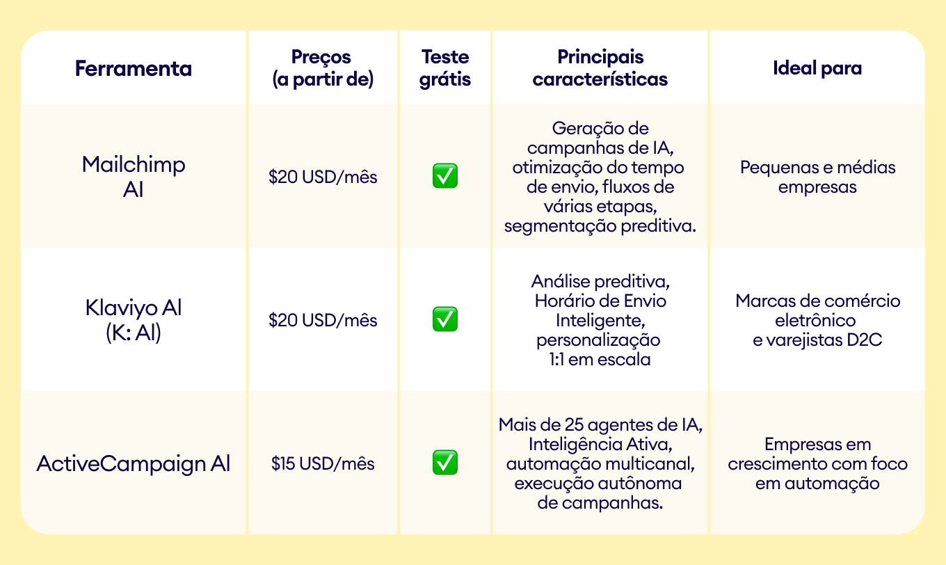 Tabela comparativa: Melhores ferramentas de marketing por e-mail com IA