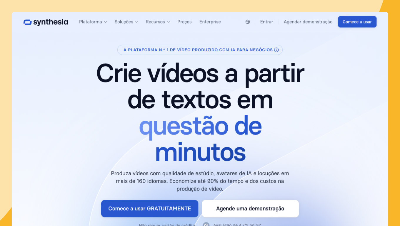 Synthesia é a opção mais robusta para equipes que precisam produzir vídeos de treinamento, vídeos explicativos de marketing, demonstrações de produtos e comunicações internas em grande escala, tudo isso sem depender de uma equipe de produção de vídeo.
