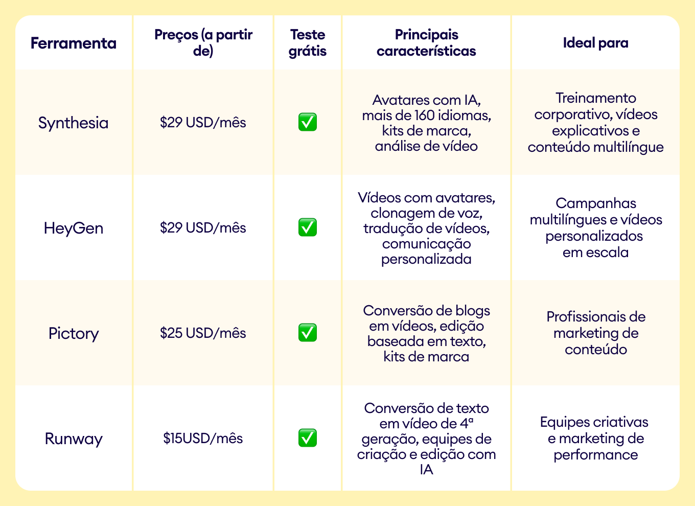 Tabela comparativa: Melhores ferramentas de IA para marketing de vídeo