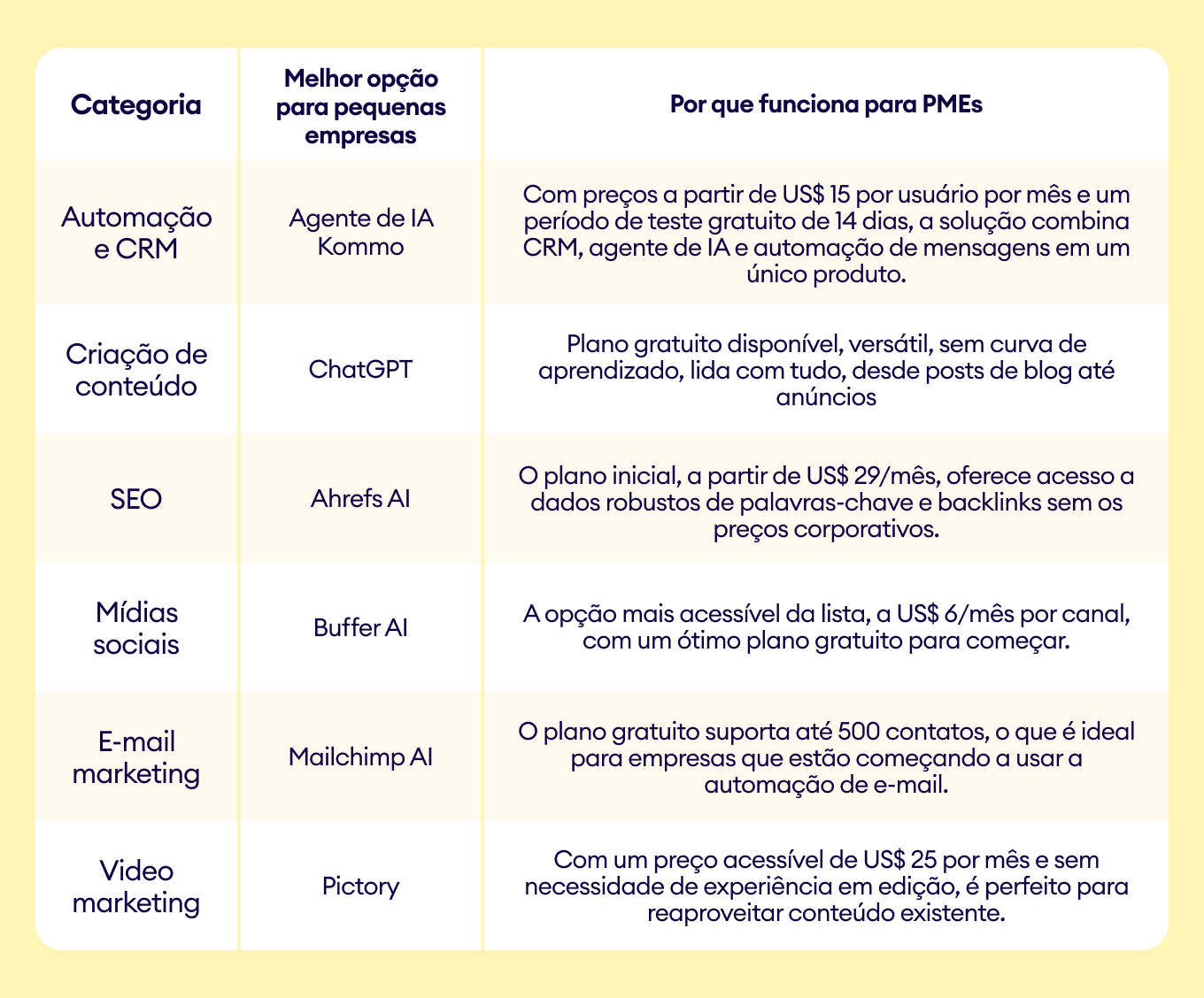 💡Dica: A estratégia inicial mais inteligente para uma pequena empresa é: ChatGPT (conteúdo) + Google Analytics 4 (análise) + Mailchimp ou ActiveCampaign (e-mail) + Buffer (redes sociais) + Kommo (CRM e automação). Isso proporciona uma operação de marketing com IA totalmente funcional por bem menos de US$ 100 por mês, e a maior parte é gratuita para começar.