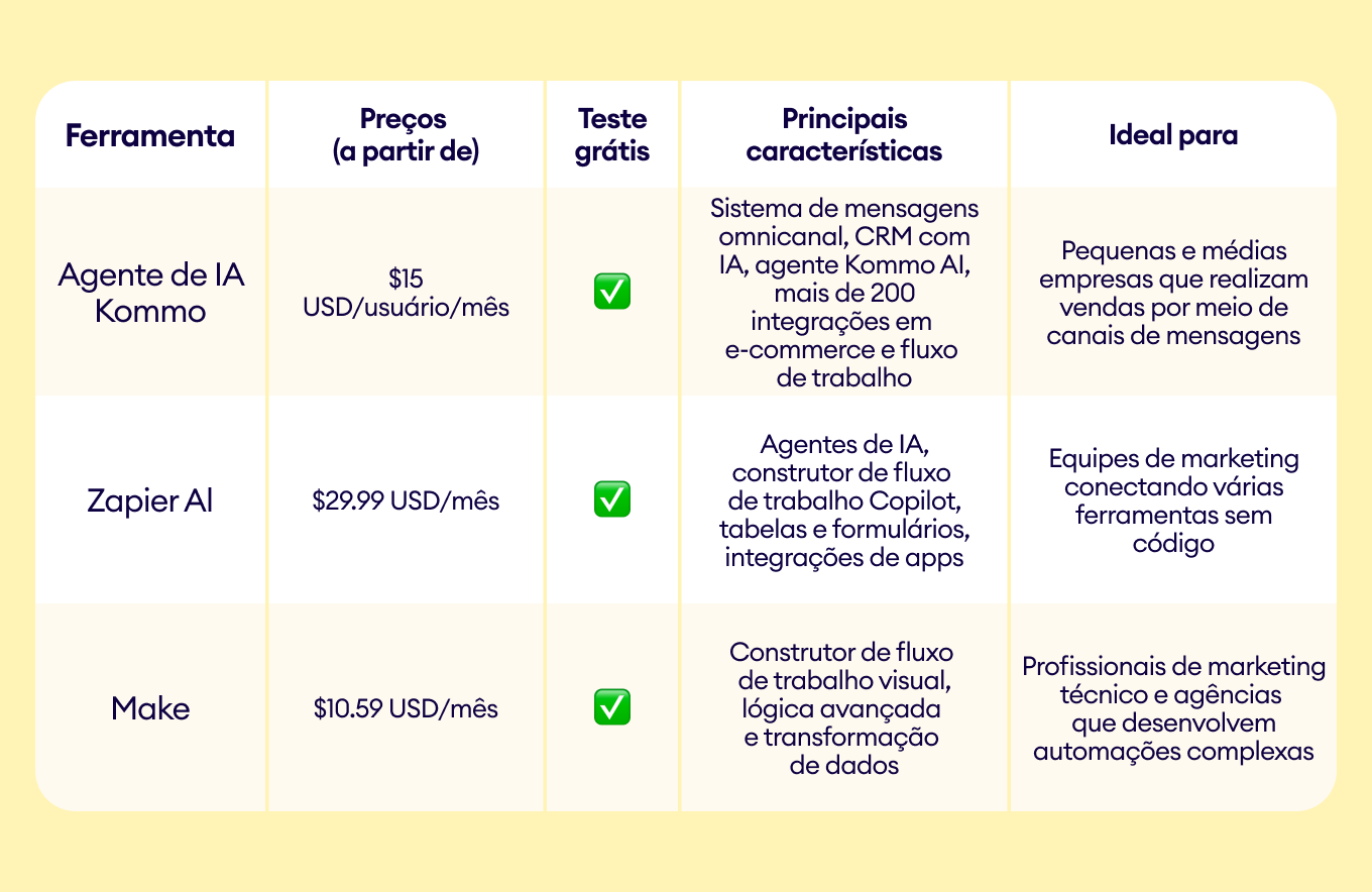 💡Dica: Cada ferramenta resolve um problema diferente. a Kommo é ideal quando você precisa de IA, CRM e mensagens em um só lugar. O Zapier conecta suas ferramentas existentes com facilidade. O Make lida com lógica complexa e fluxos de alto volume.