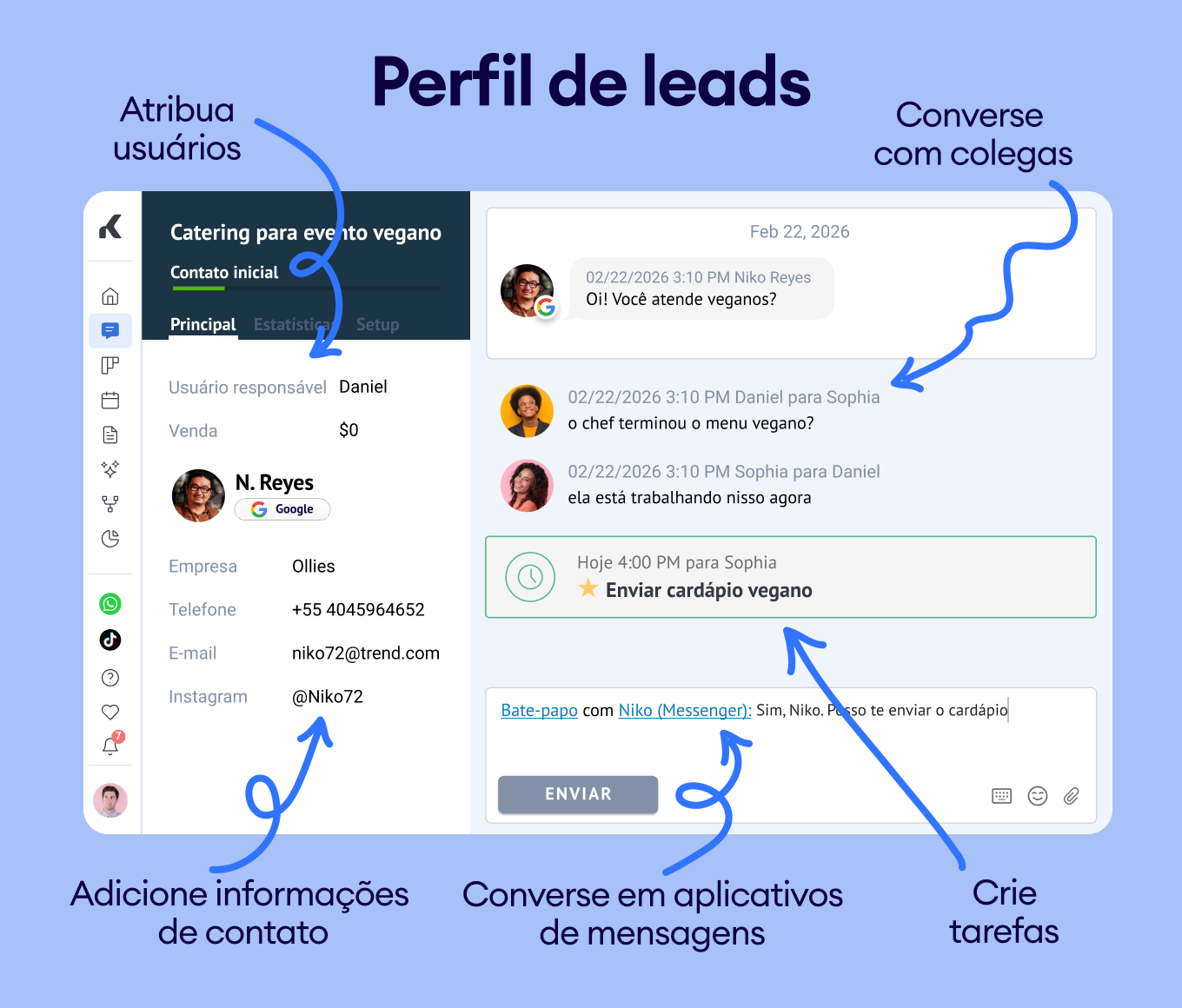 Quando se trata de vender, velocidade é tudo. Acelere sua velocidade de resposta com nosso Google CRM com automatização, o chatbot para WhatsApp, chatbot para Instagram e muito mais. A melhor parte? Com nosso CRM, você pode personalizar modelos com informações do perfil do lead, para que nenhuma mensagem pareça robótica.