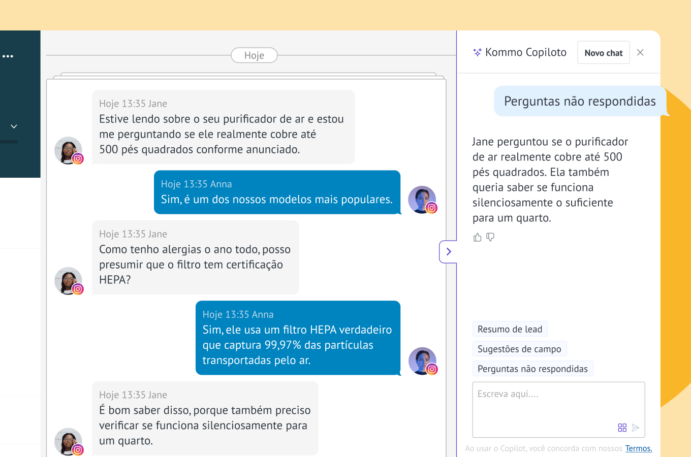 O Kommo Copilot é seu guia sob demanda e especialista em eficiência, funcionando diretamente dentro da plataforma. Ele foi projetado para solucionar dúvidas dos usuários, concluir tarefas tediosas de dados e acelerar fluxos de trabalho para que sua equipe possa se concentrar exclusivamente em vendas.
