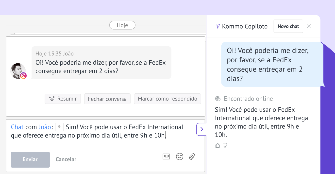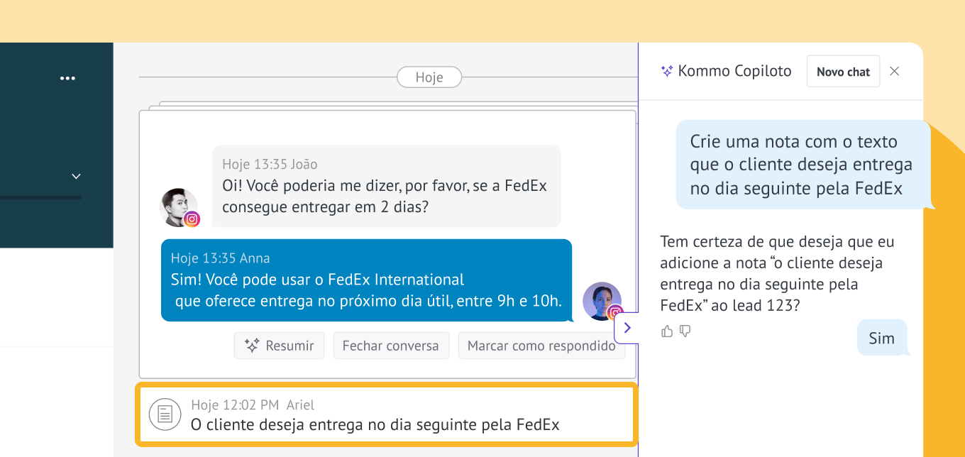 O Kommo Copilot obtém respostas instantâneas e verificadas de fontes confiáveis para responder às perguntas dos clientes que vão além do seu produto, garantindo que sua equipe esteja sempre preparada e profissional.
