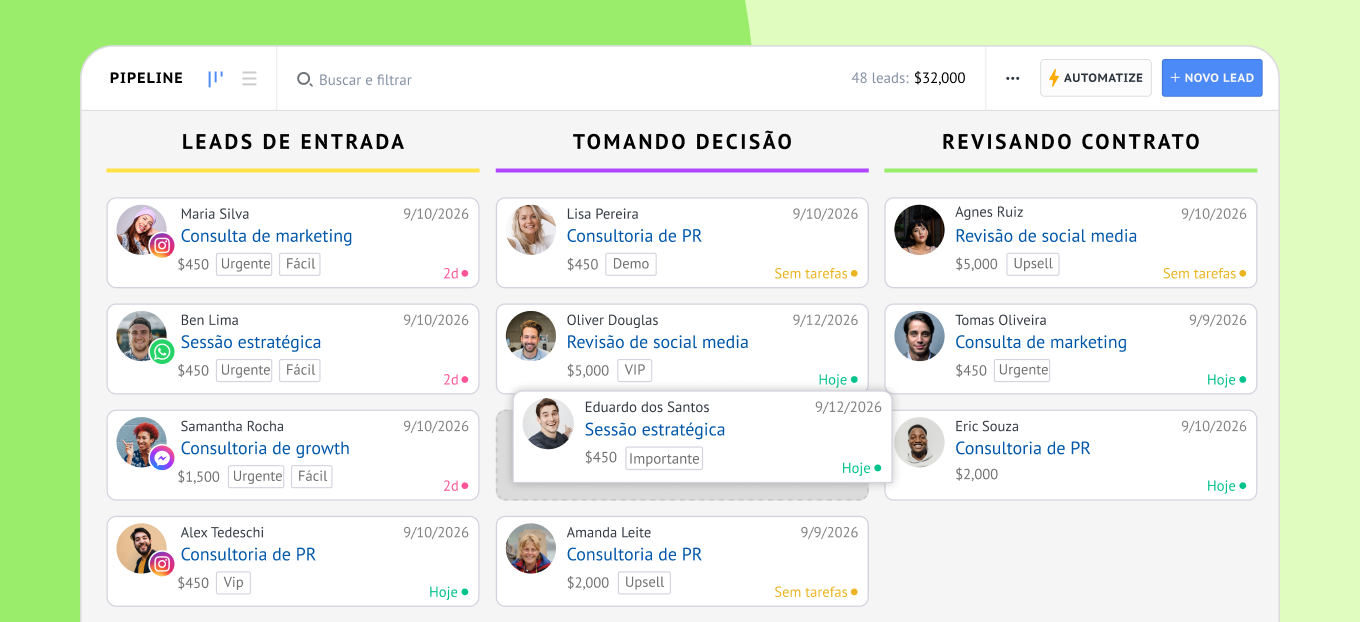 Não se limite a iniciar conversas — finalize-as. A Kommo amplia o poder da IA do Instagram com um CRM desenvolvido para vendas em redes sociais, que inclui captura automatizada de leads, engajamento instantâneo com IA e um funil de vendas visual. Experimente.VamosGrátis por 14 dias!