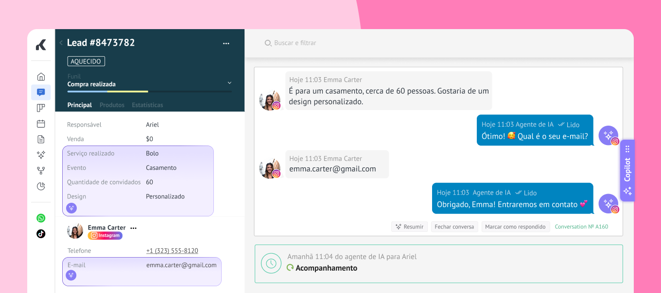 Enquanto a IA do Instagram identifica clientes em potencial, as ferramentas de IA da Kommo os compreendem e agem de acordo com eles, garantindo que nenhum lead do seu público do Instagram seja desperdiçado.