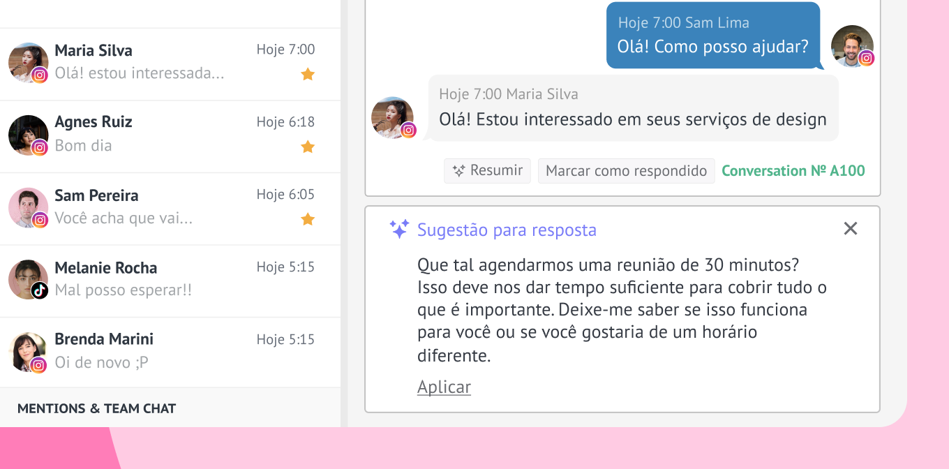 Caixa de entrada unificadaReúne todas as interações do Instagram, como mensagens diretas, comentários e respostas aos Stories, juntamente com conversas de outros canais, em um único painel.