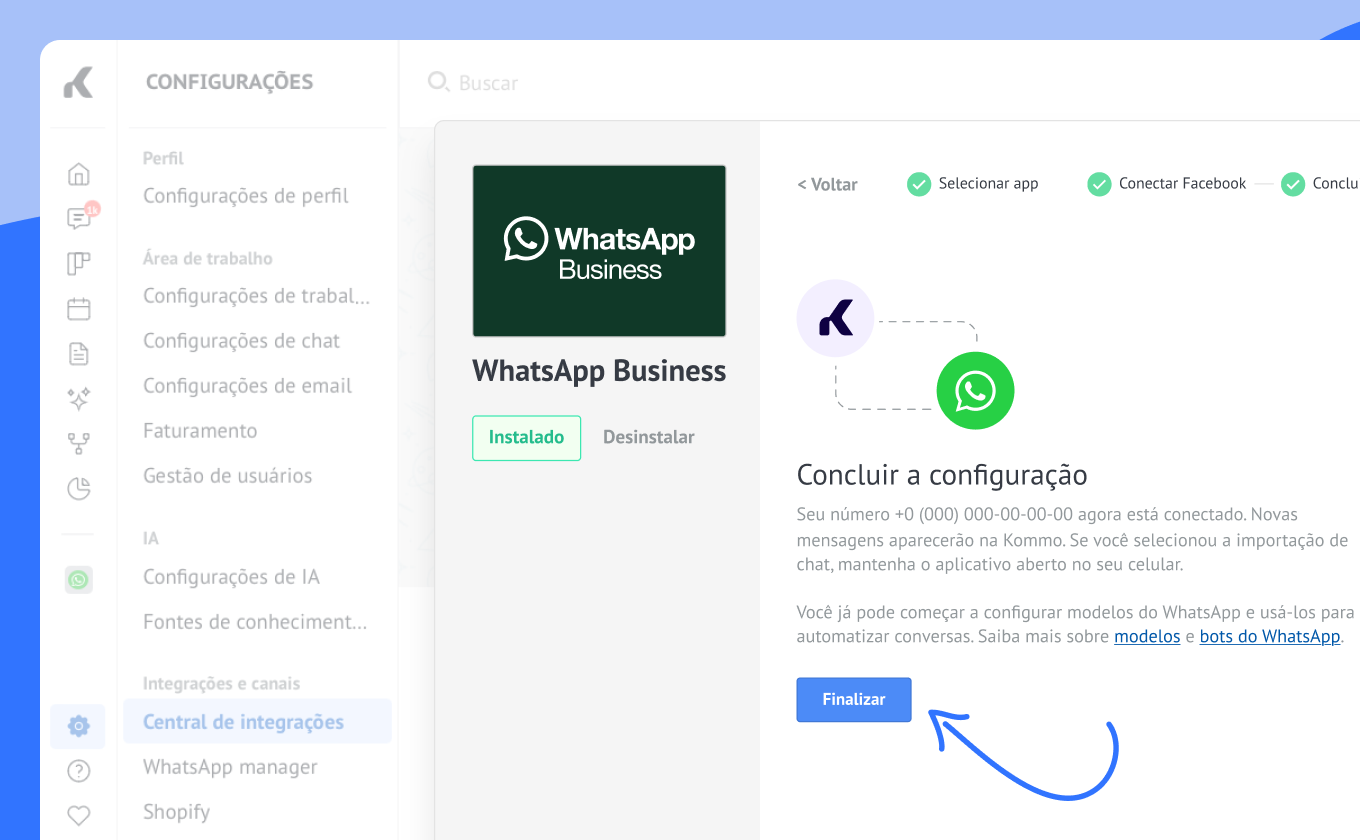 Você será redirecionado para a Kommo e verá um modal para finalizar a configuração. Clique em Terminar.