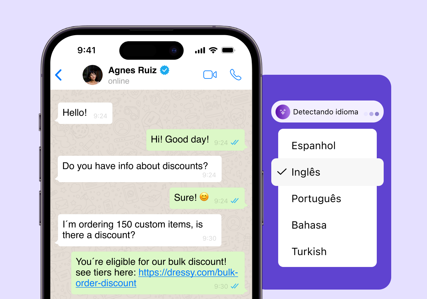 O agente de IA da Kommo supera as barreiras linguísticas sem esforço. Ele consegue detectar e responder no mesmo idioma que seus clientes usam, agora com suporte para Inglês, espanhol, português, indonésio, e turco. As conversas permanecem naturais, contextualizadas e fiéis à voz da sua marca.