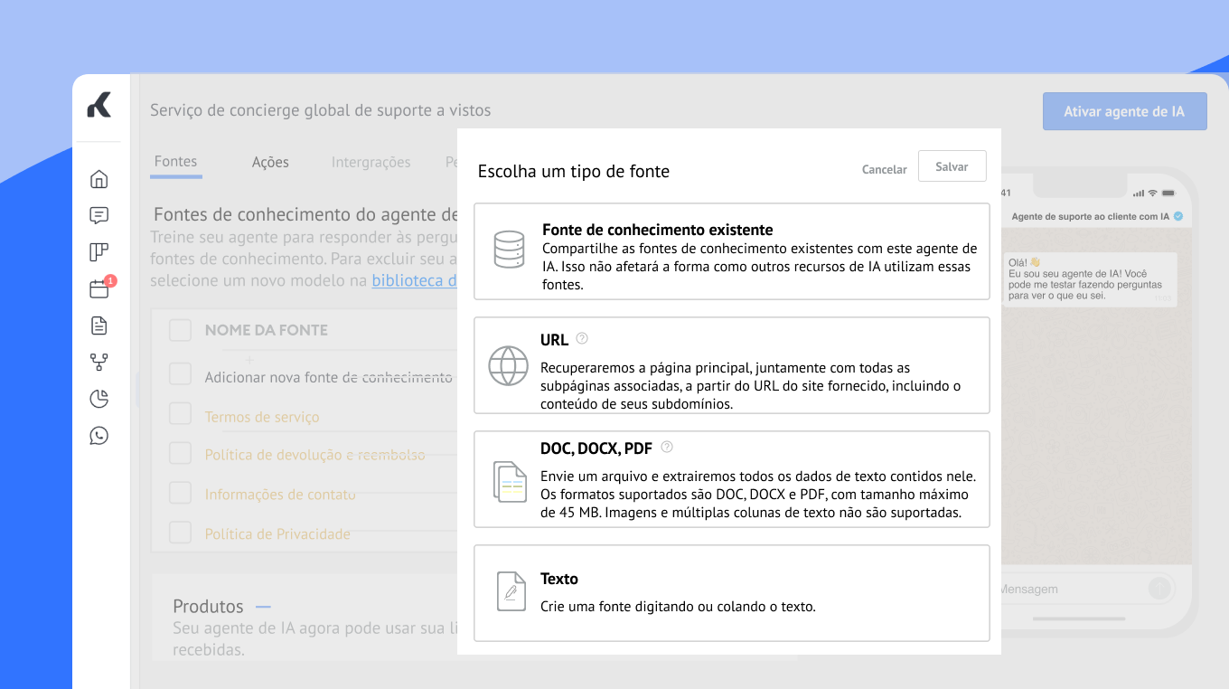 Fontes: Faça upload de arquivos, cole textos ou importe URLs para que sua IA tenha sempre informações atualizadas sobre produtos, políticas ou perguntas frequentes.