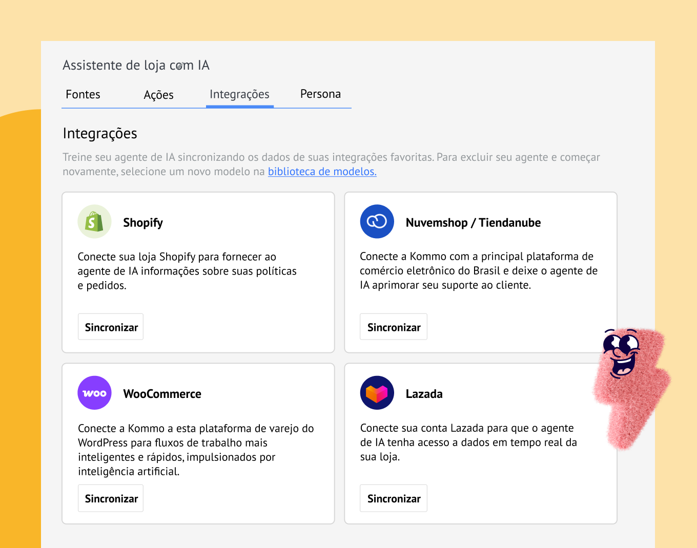 Integrações: Conecte lojas de comércio eletrônico como Shopify, WooCommerce, Lazada ou Nuvemshop para dar à sua IA acesso em tempo real a pedidos, produtos e níveis de estoque.