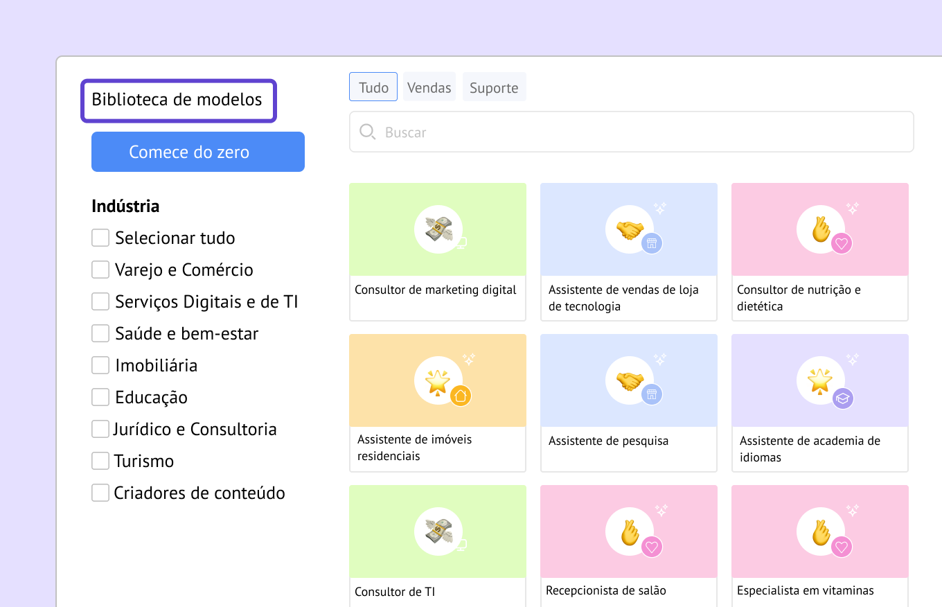Escolha um modelo de Agente de IA especializado, adaptado ao seu setor e função.