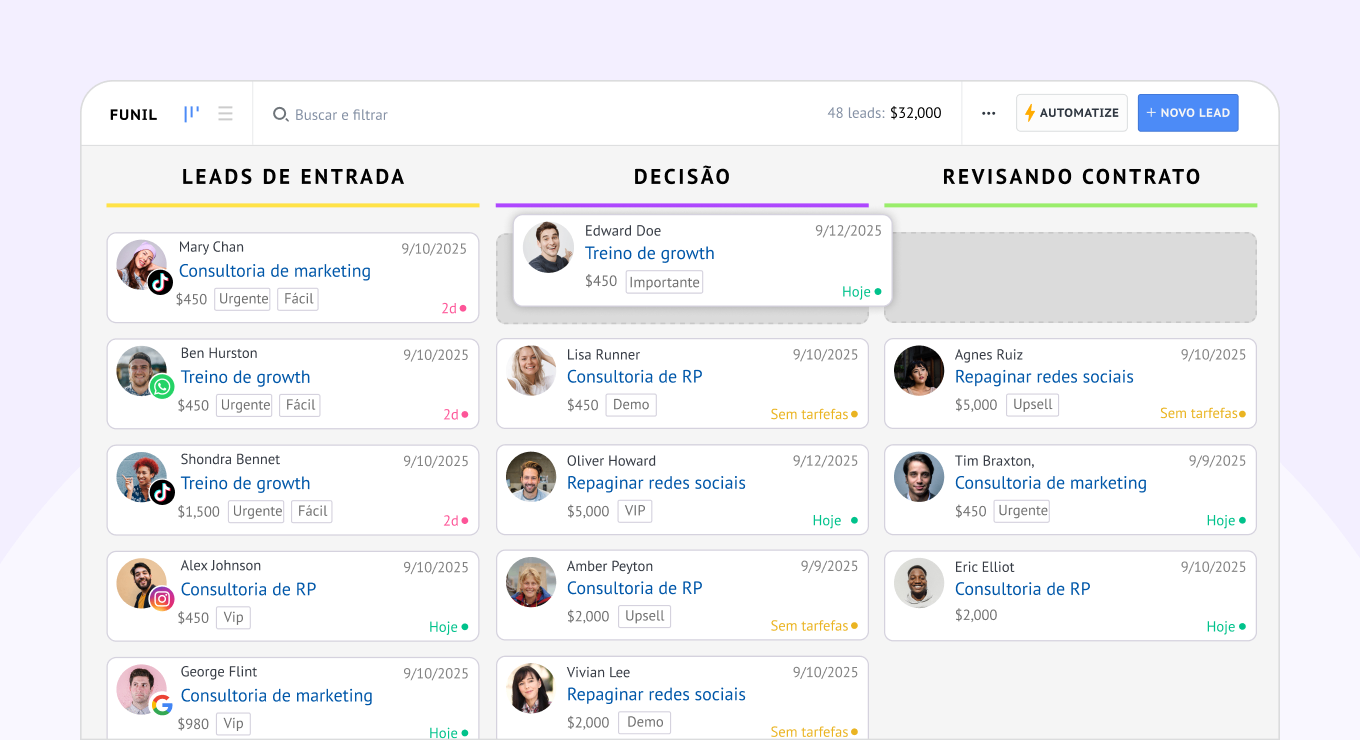 A caixa de entrada unificada da Kommo funciona como seu único centro de comando, consolidando chats de todos os canais em um feed contínuo, garantindo que sua equipe nunca perca um lead.