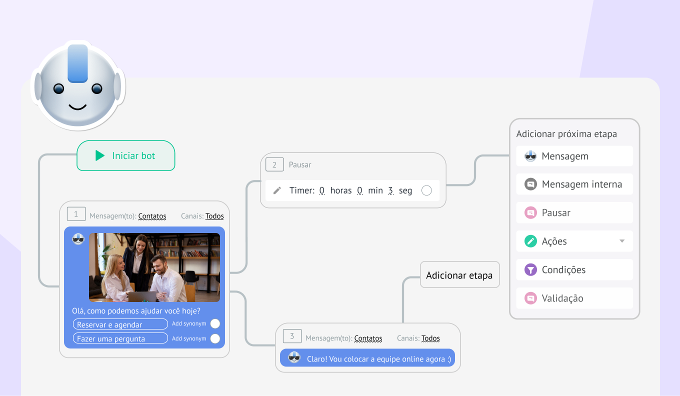 Com o chatbot da Kommo, também conhecido como Salesbot, você pode configurar bots inteligentes e sem código que entram em contato com seus leads, coletam detalhes, qualificam e atribuem leads, sem envolvimento humano.