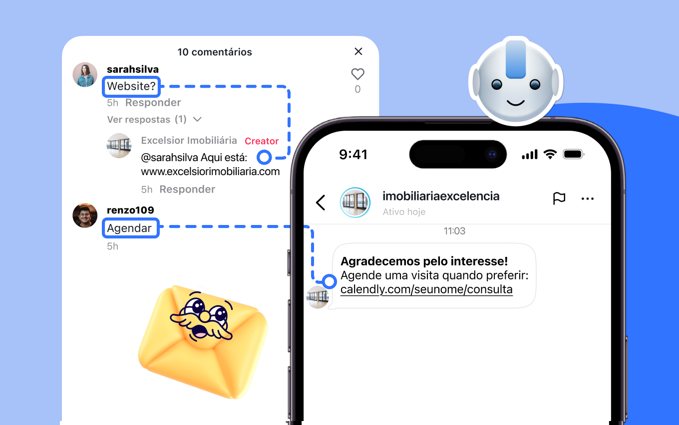 Com a Kommo, você pode coletar cada comentário e mensagem e ir ainda mais longe implantando o Salesbot com tecnologia de IA da Kommo, que pode interagir instantaneamente com comentários e mensagens e até mesmo atribuir um lead específico a um agente específico na sua equipe de vendas, tudo no piloto automático.
