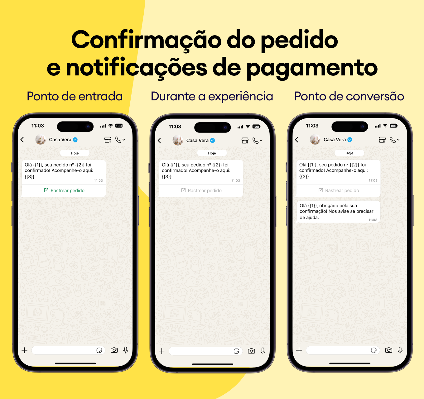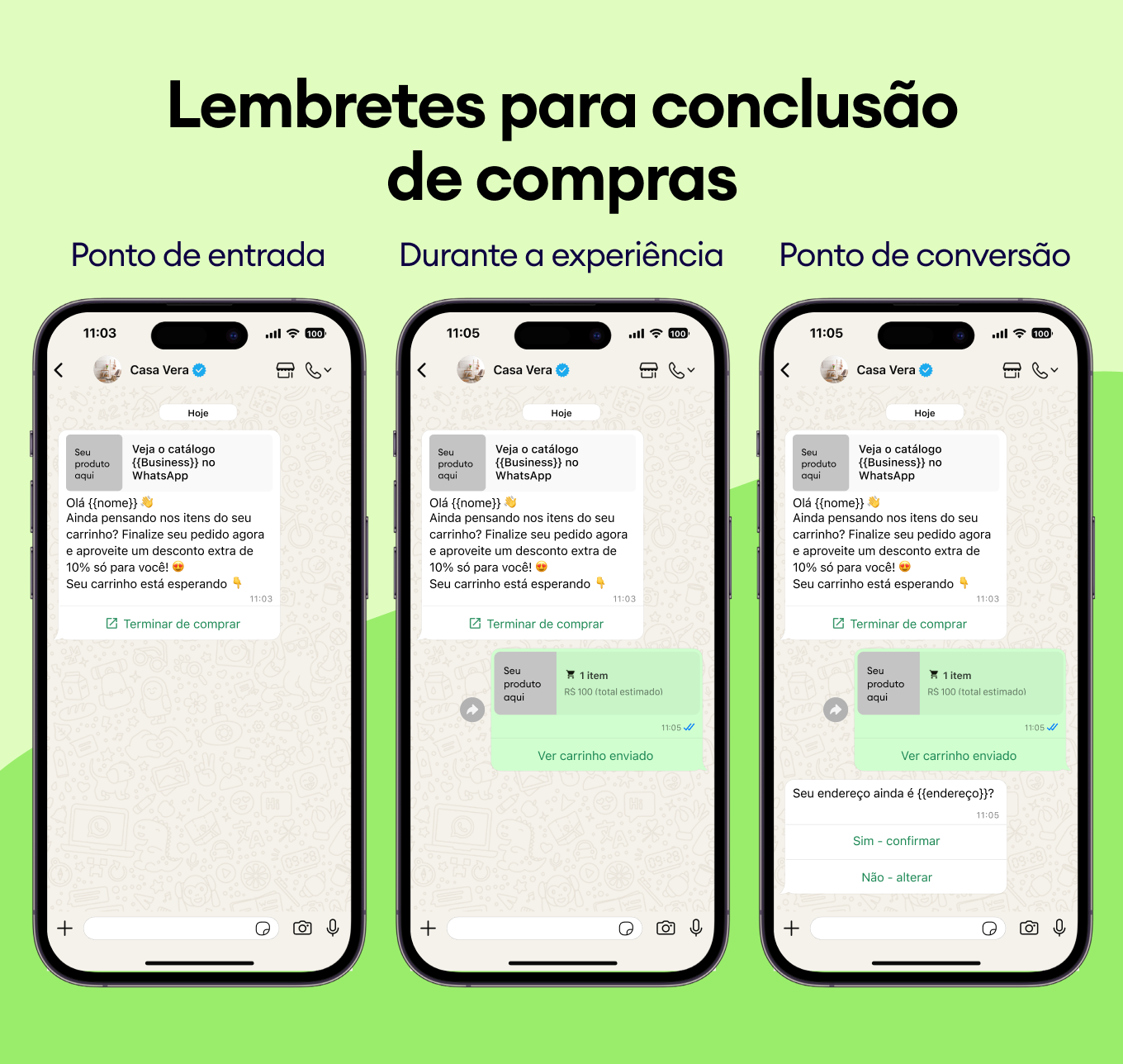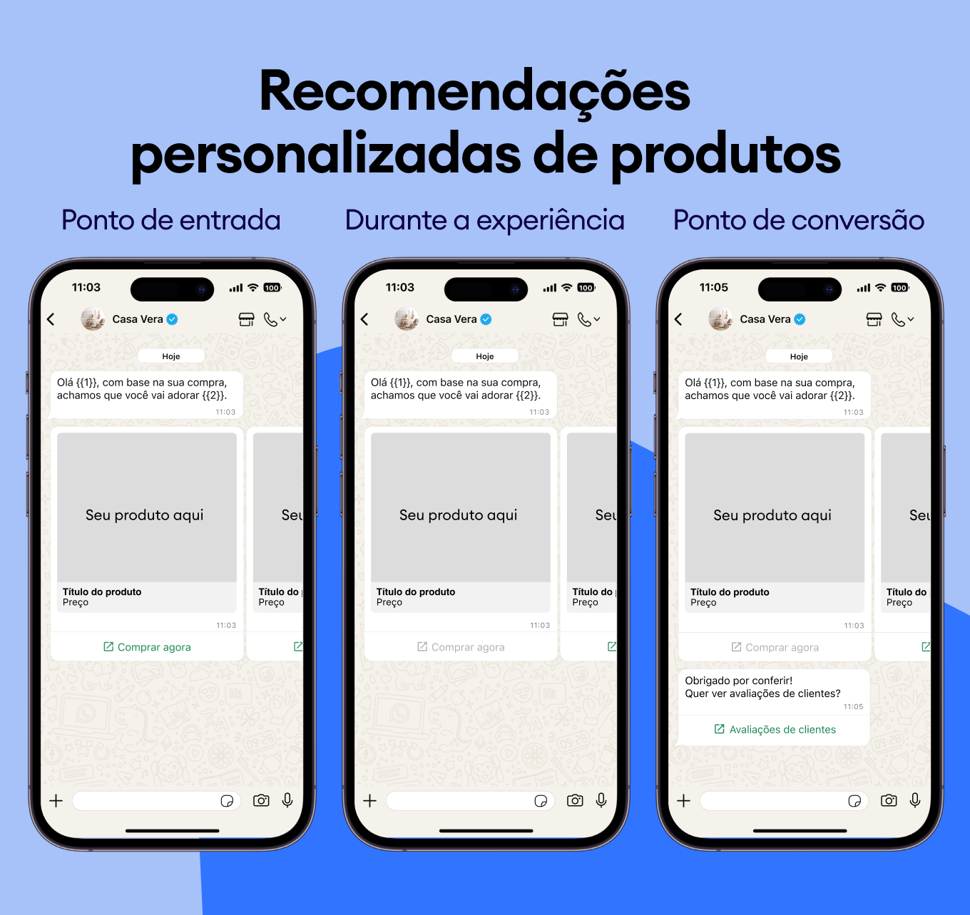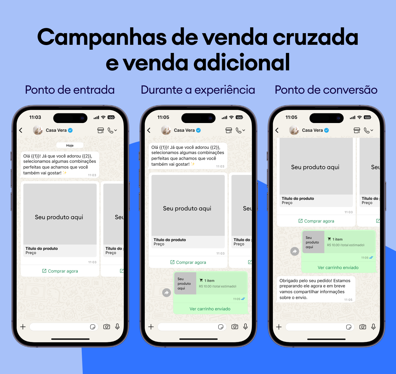 Recomende produtos complementares e destaque melhorias com modelos do WhatsApp que aprimoram instantaneamente a experiência do cliente.