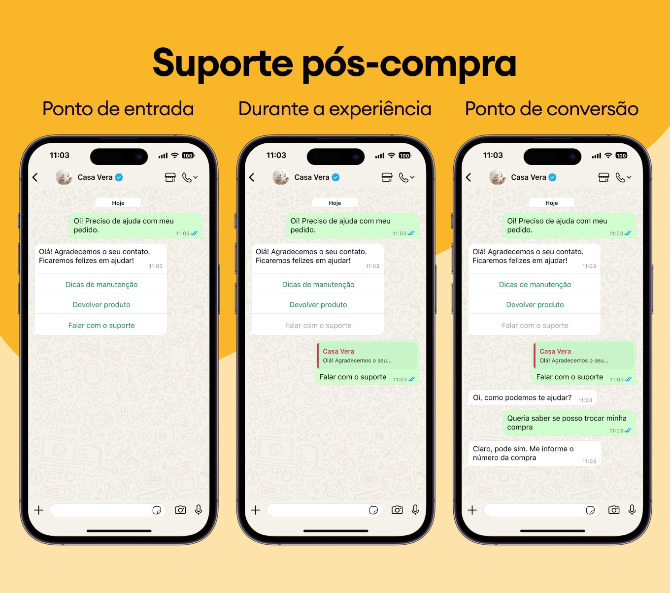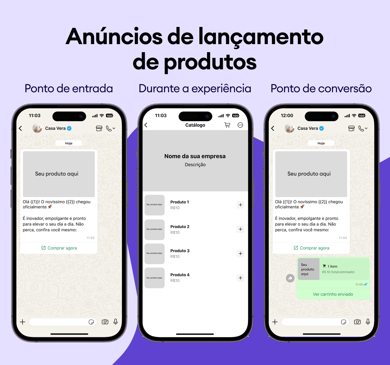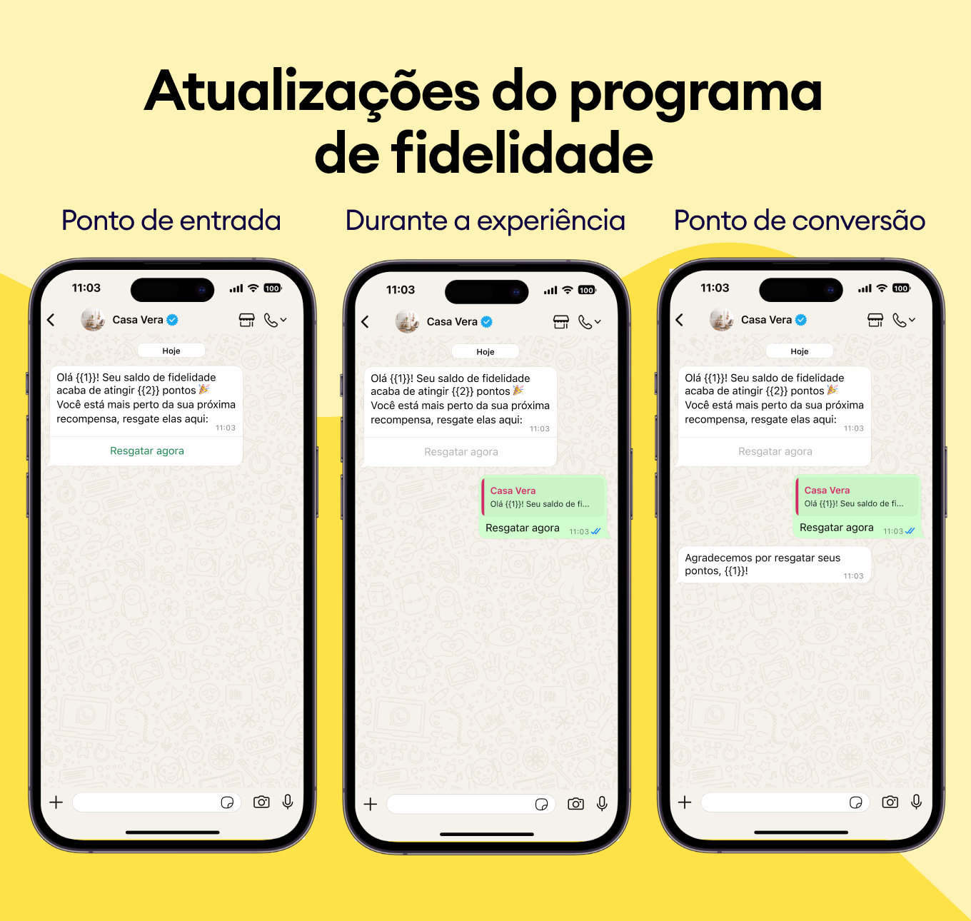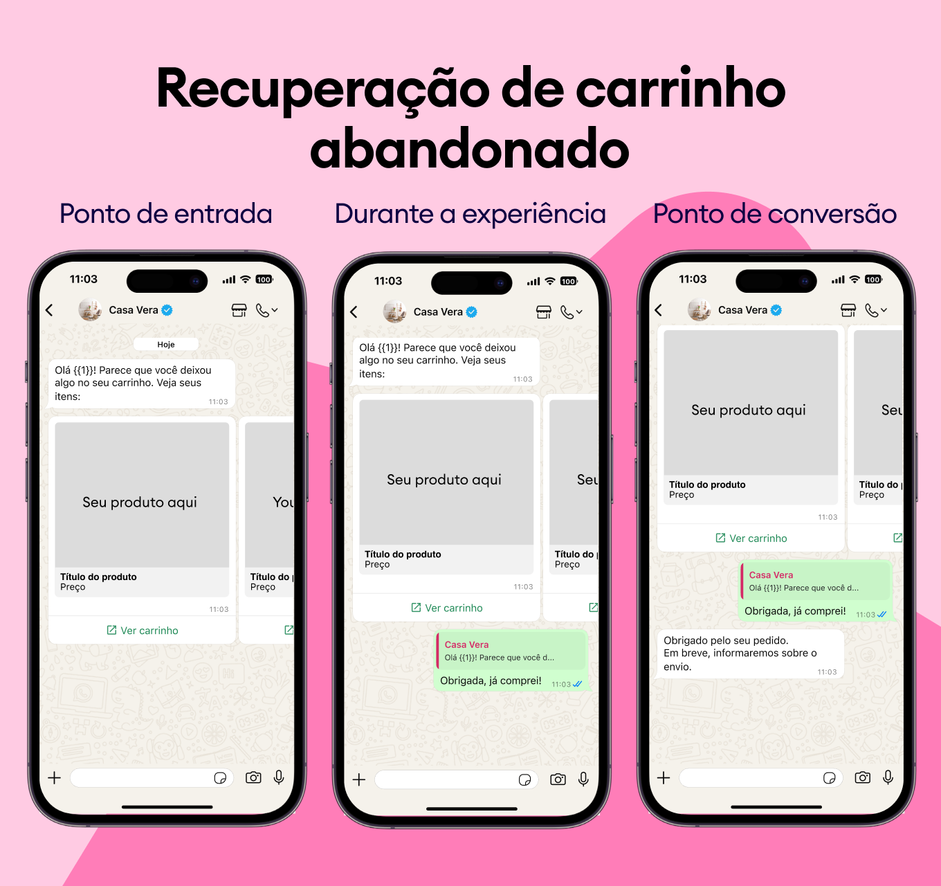 Recomende produtos complementares e destaque melhorias com modelos do WhatsApp que aprimoram instantaneamente a experiência do cliente.
