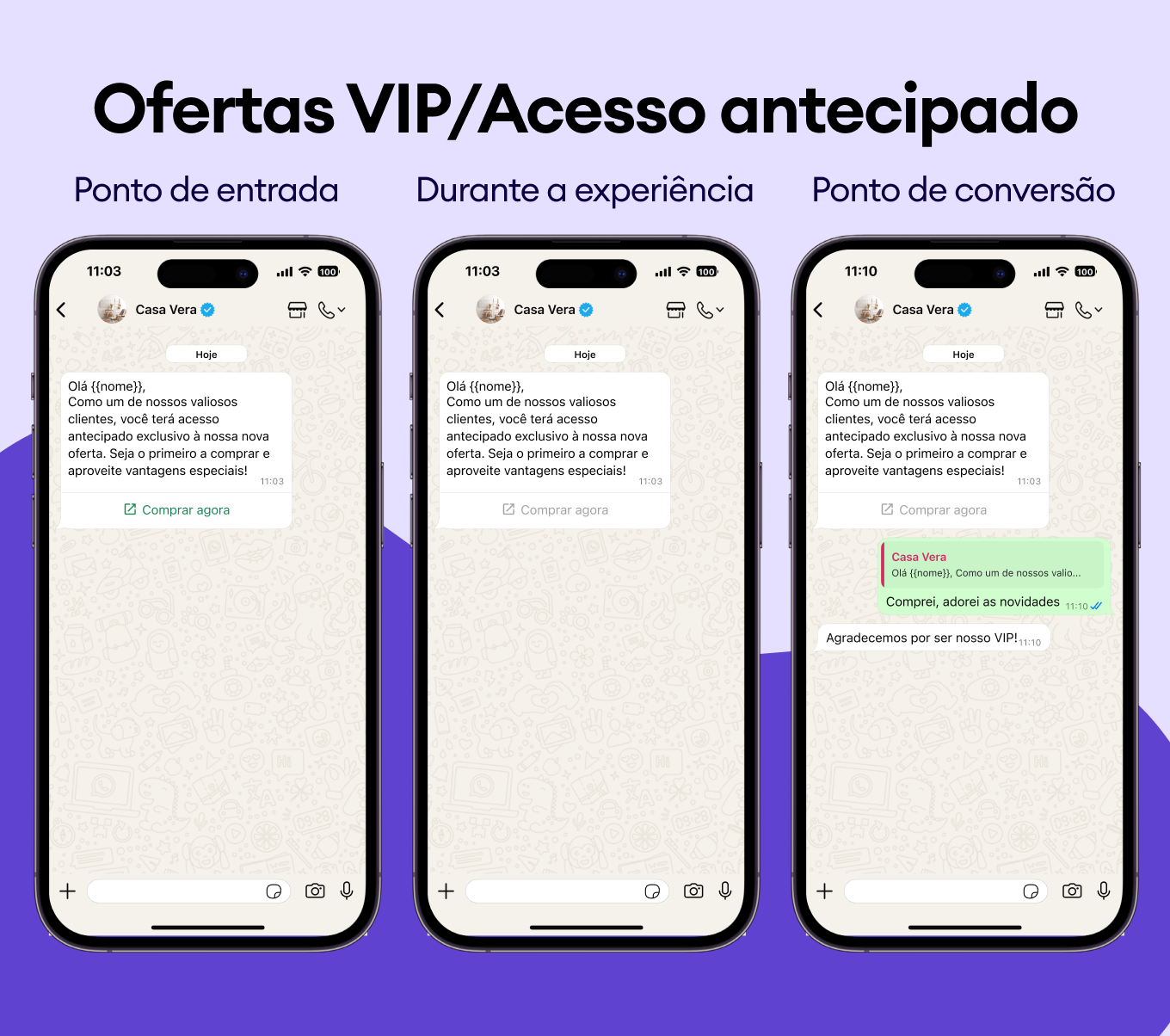 Lançamento de nova coleção? Exclusividade garantida? Ofereça aos seus melhores clientes em primeira mão, antes de qualquer outra pessoa, com mensagens personalizadas para WhatsApp. Faça com que eles se sintam os privilegiados que são.