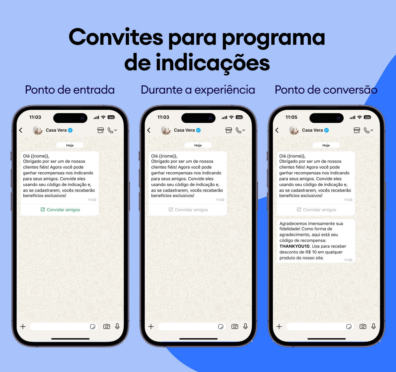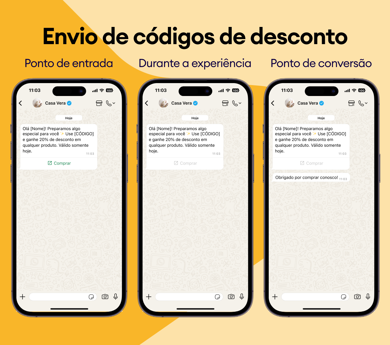 Compartilhe códigos promocionais e descontos personalizados que seus clientes vão querer usar — diretamente no chat do WhatsApp.