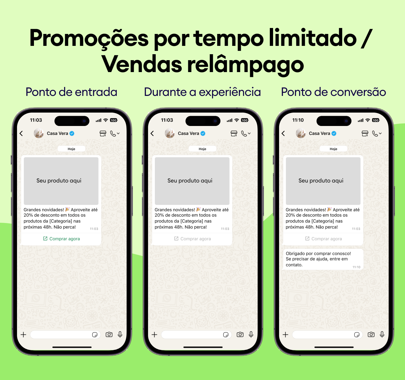 Envie ofertas urgentes com botões “Comprar agora” diretamente para os chats dos clientes para garantir receita antes que o tempo acabe.