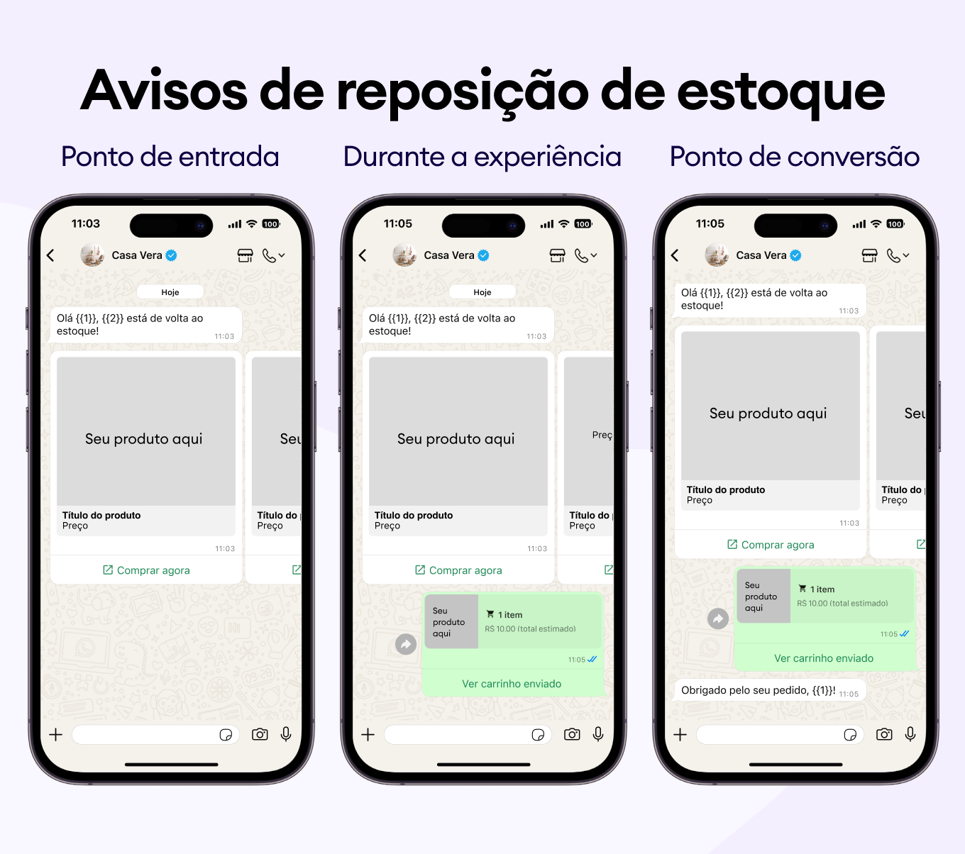Envie um aviso aos seus clientes com um modelo simples de mensagem do WhatsApp quando o produto favorito deles estiver de volta ao estoque, para que eles possam comprá-lo antes que acabe novamente.