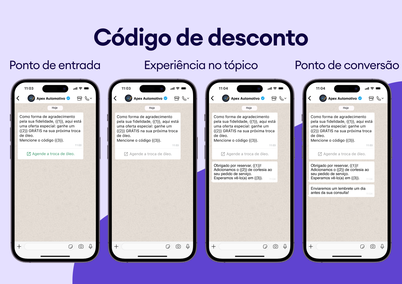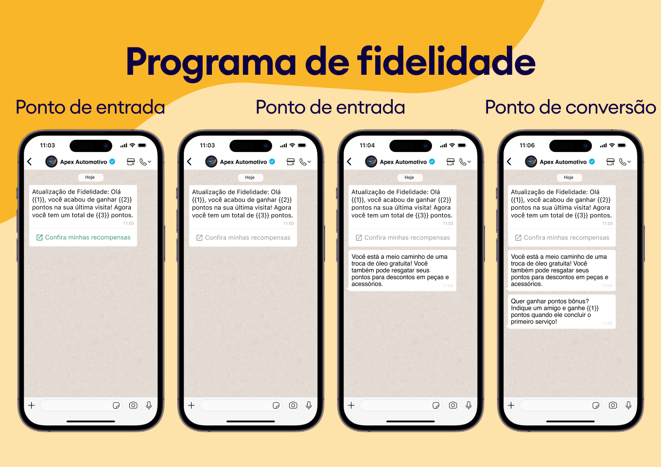 Implemente estes 15 modelos profissionais de WhatsApp para transformar seus pontos de contato com o cliente — de lembretes de serviço a acompanhamento de vendas — em um fluxo de trabalho automatizado e gerador de receita. Construa maior confiança, elimine faltas e garanta mais negócios recorrentes usando a plataforma que seus clientes preferem.