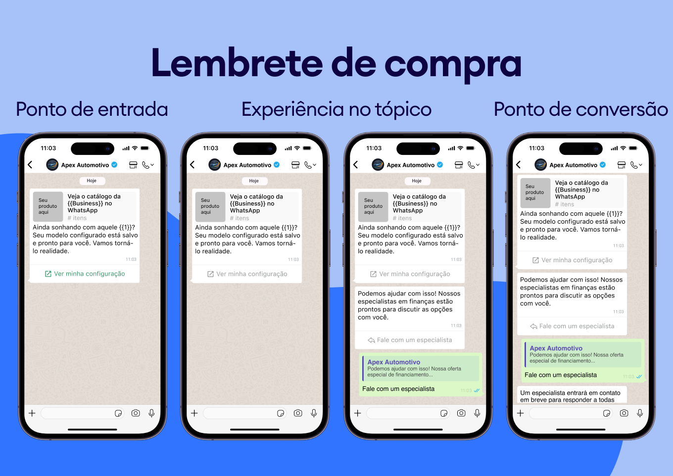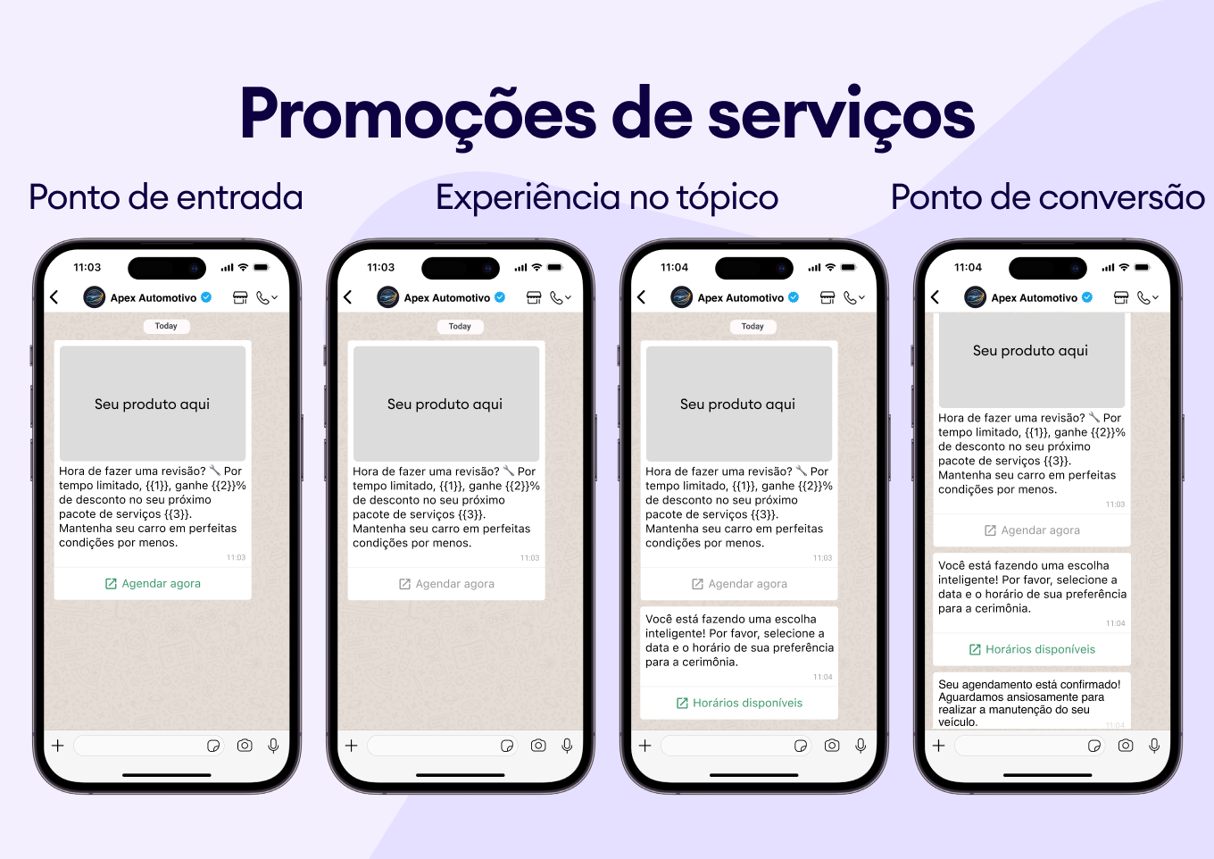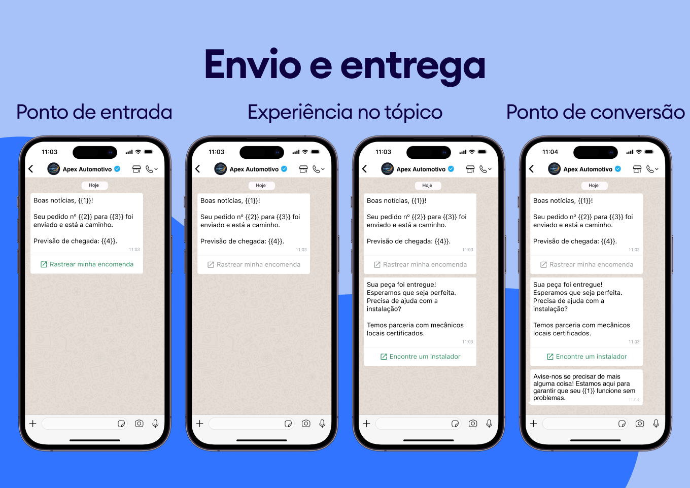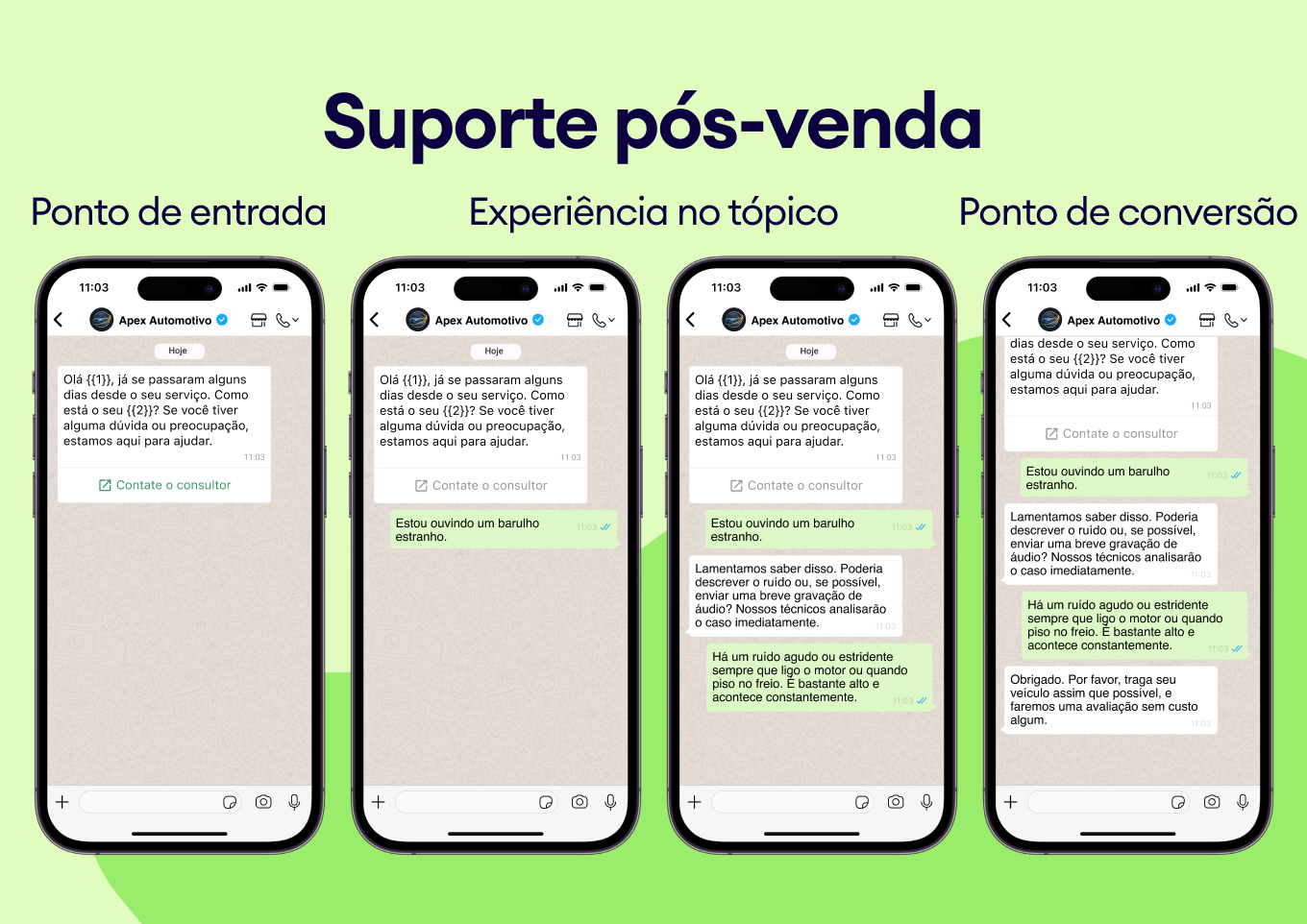 Para a indústria automotiva, isso é revolucionário: automatize lembretes de serviço, atualizações sobre o status de reparos e notificações de chegada de peças. Os modelos do WhatsApp garantem que sua comunicação seja consistente, profissional e sempre entregue — chega de mensagens perdidas na caixa de entrada de SMS do cliente.