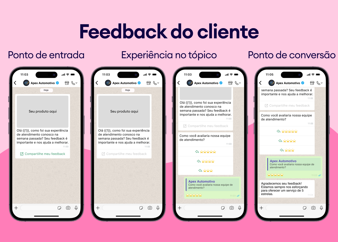 Receba feedback instantâneo diretamente no WhatsApp. Envie uma solicitação automática após o serviço ou compra com botões de avaliação rápida para aumentar a coleta de avaliações sem esforço.
