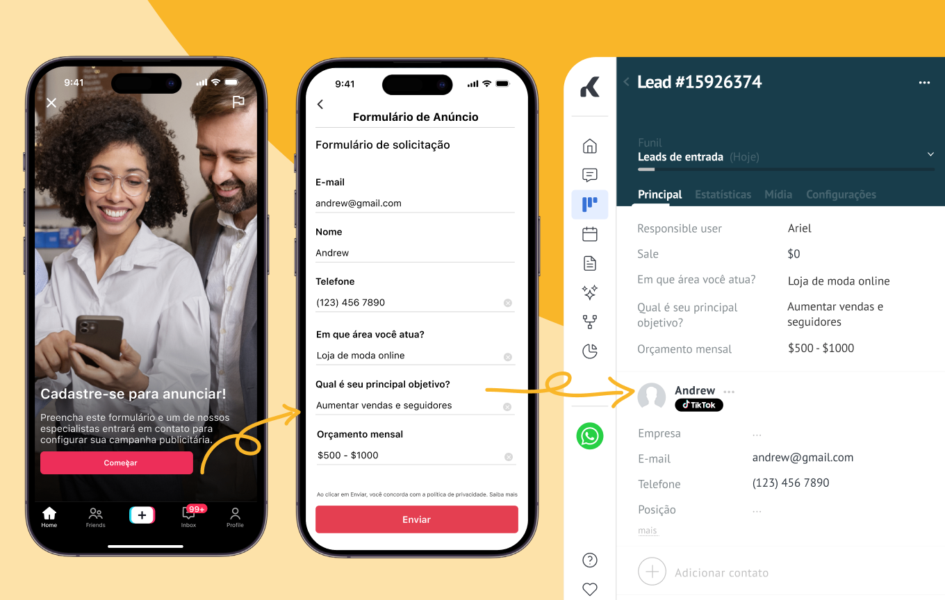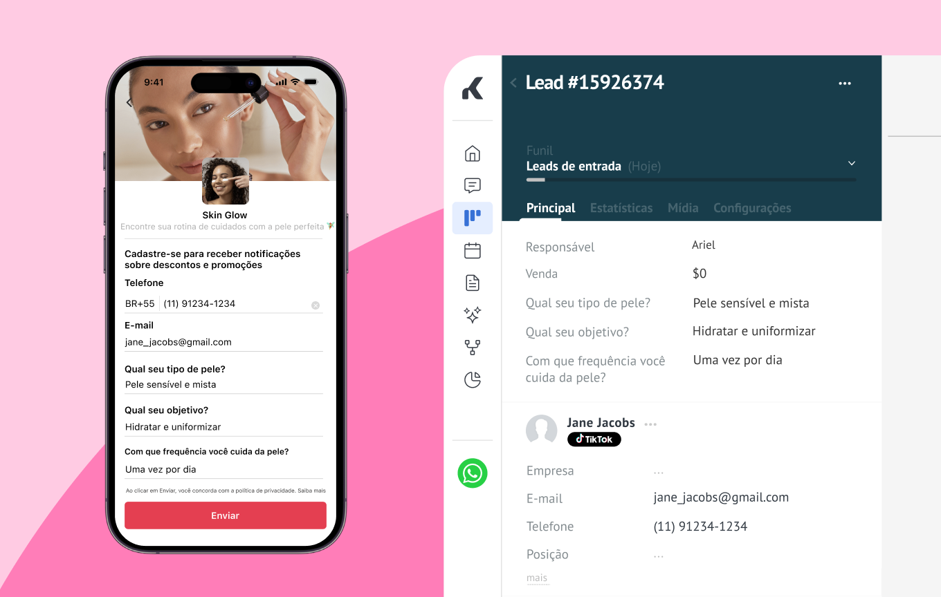 Essa integração converte cliques em anúncios do TikTok em oportunidades de negócios reais, permitindo que sua equipe faça o acompanhamento com mais eficiência, mantenha-se organizada e impulsione o aumento da receita.