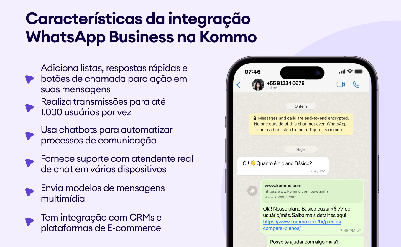 Aqui estão os outros benefícios da integração do WhatsApp Business com a Kommo 👇