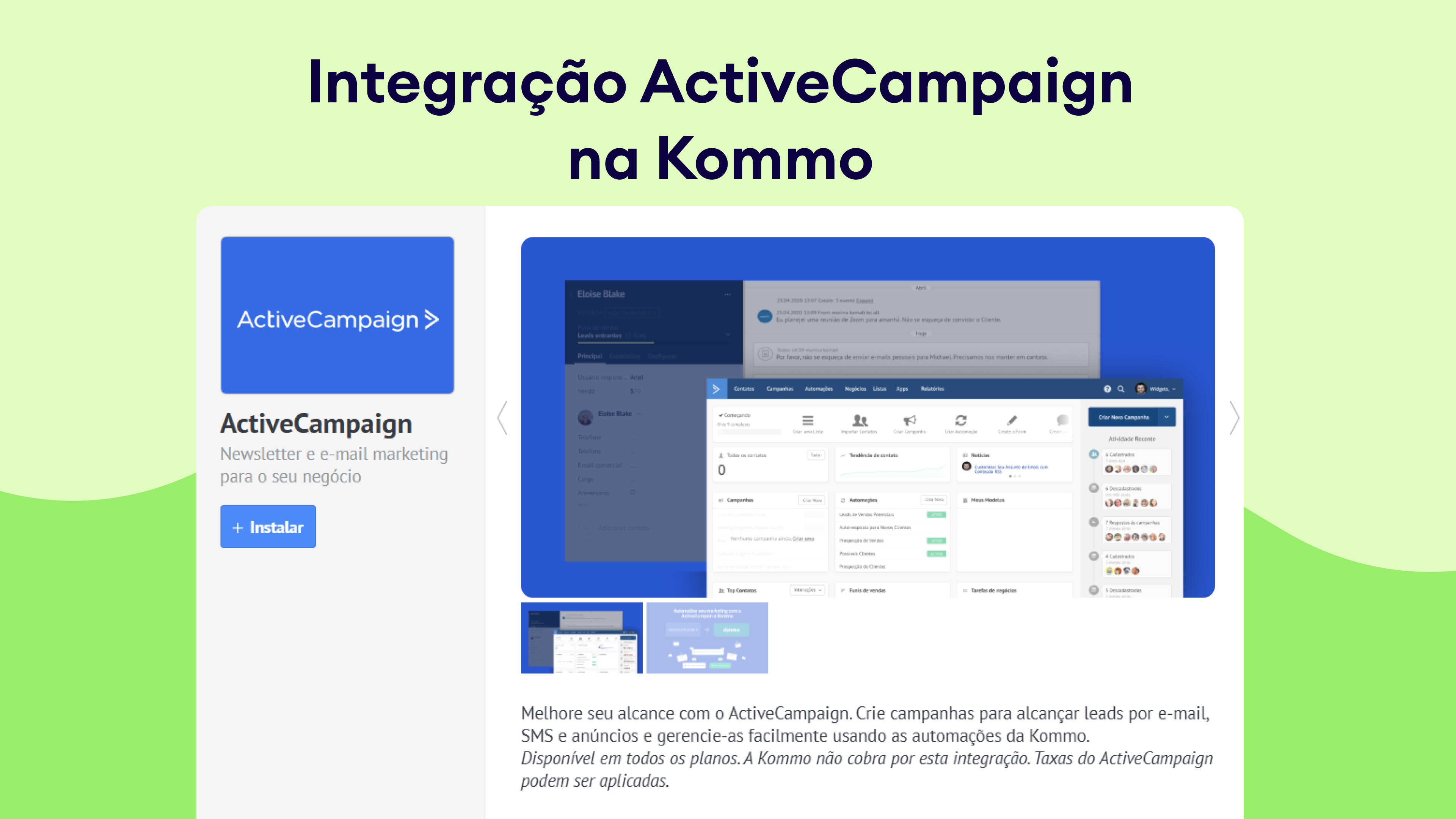 Acesse Configurações > Integrações > Pesquise ActiveCampaign e clique em Instalar.