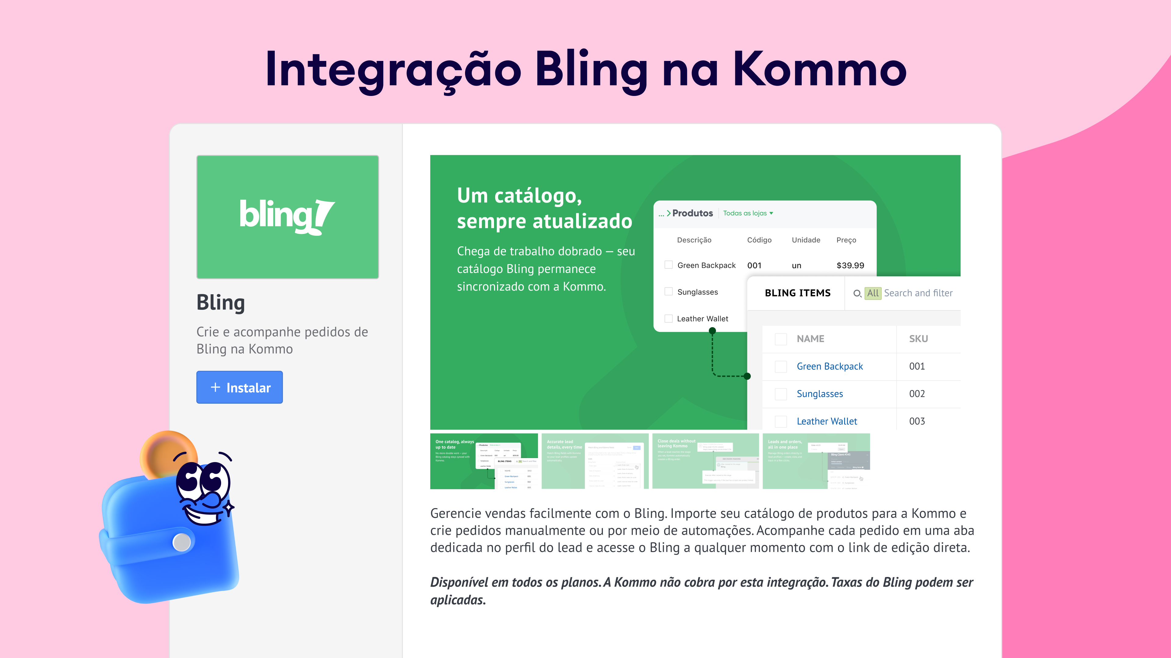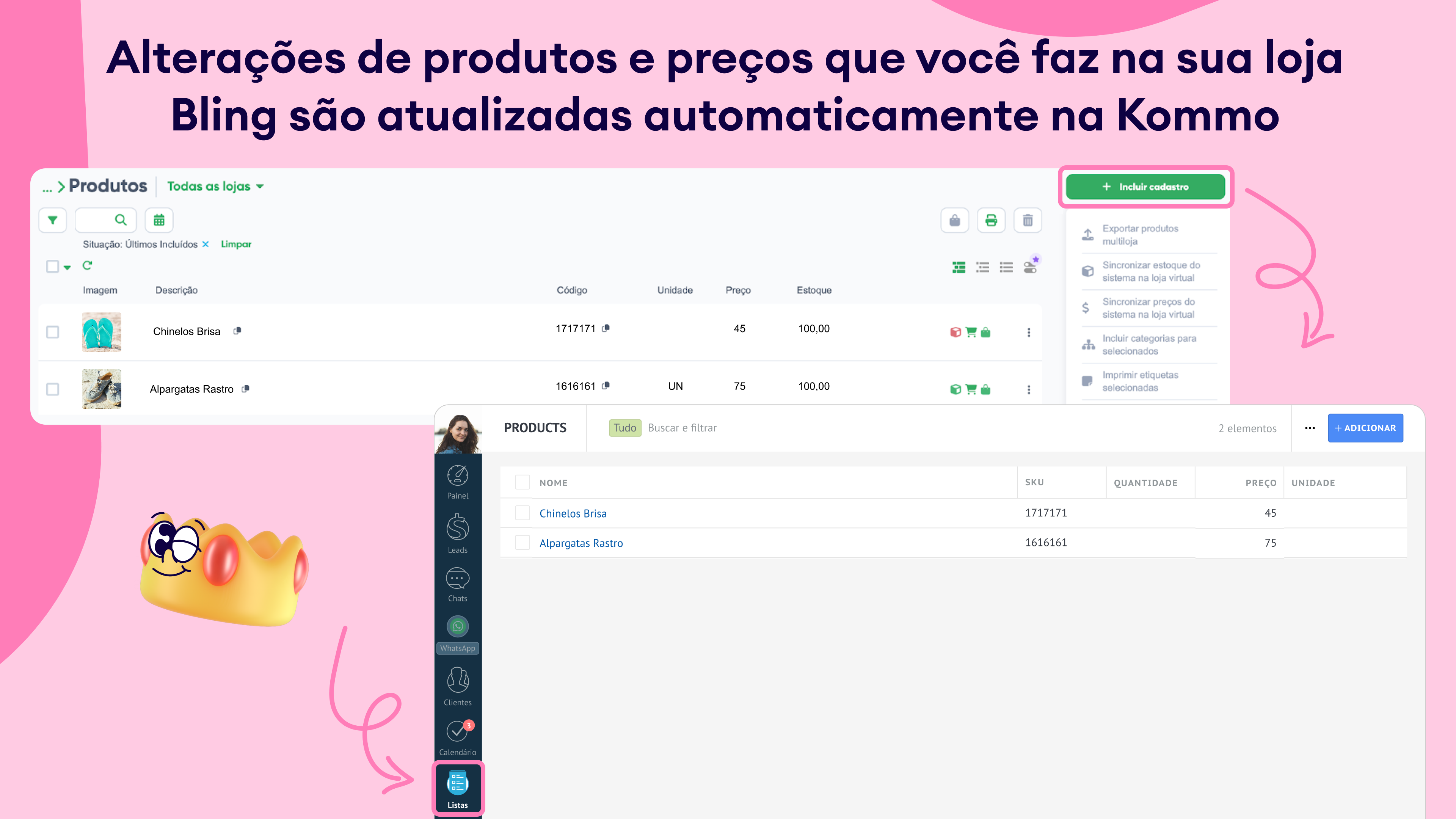 Importação automática de produtos: Sincronize todo o seu catálogo de produtos Bling diretamente com a Kommo para facilitar o acesso aos cartões de leads.