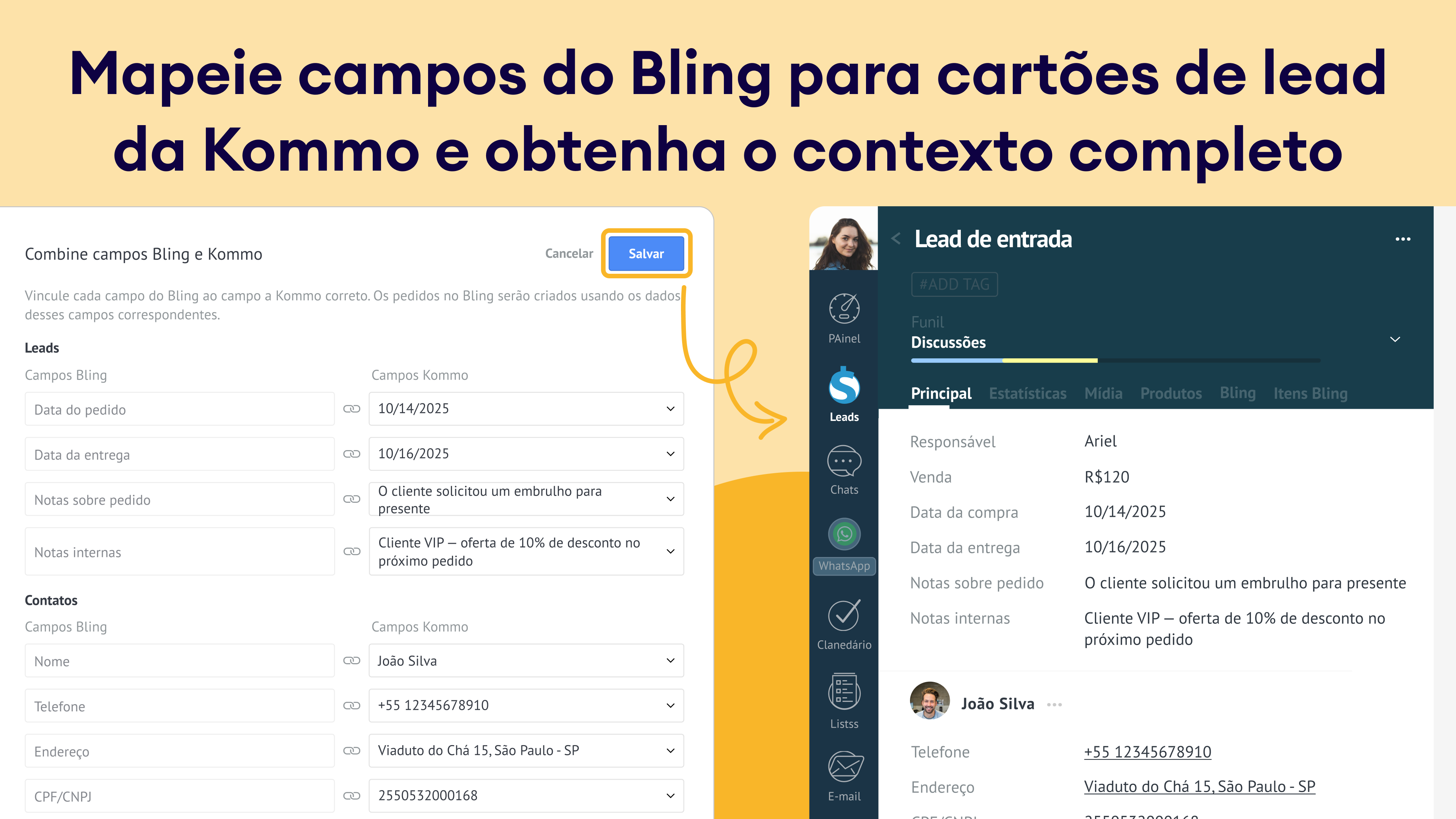 Clique em Campos de correspondência no cartão de integração e vincule os campos Kommo aos campos Bling e clique em Salvar.