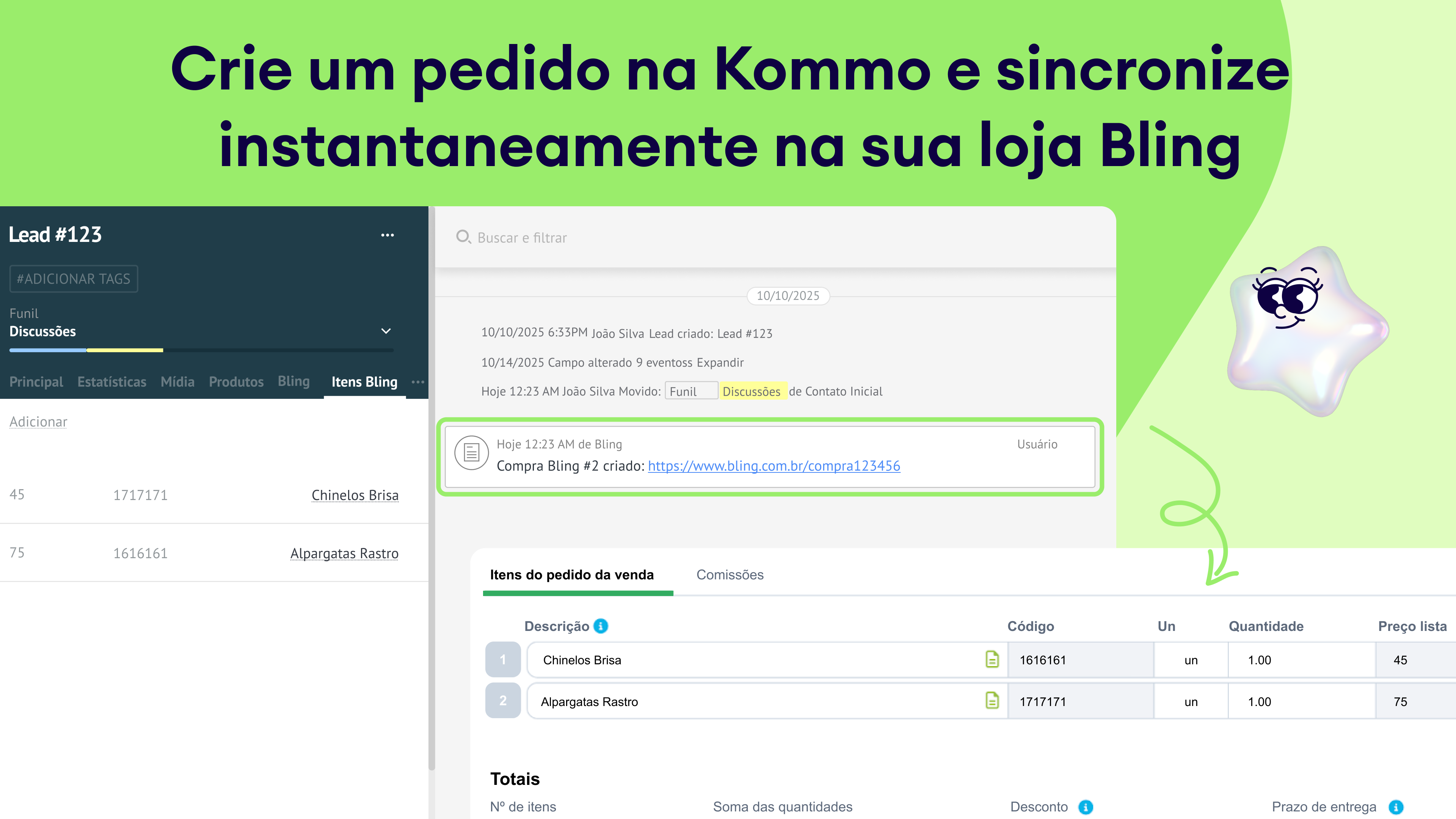 Guias de leads personalizadas: Adicione uma aba dedicada de itens do Bling aos seus cartões de leads para gerenciar produtos e solicitar itens facilmente.