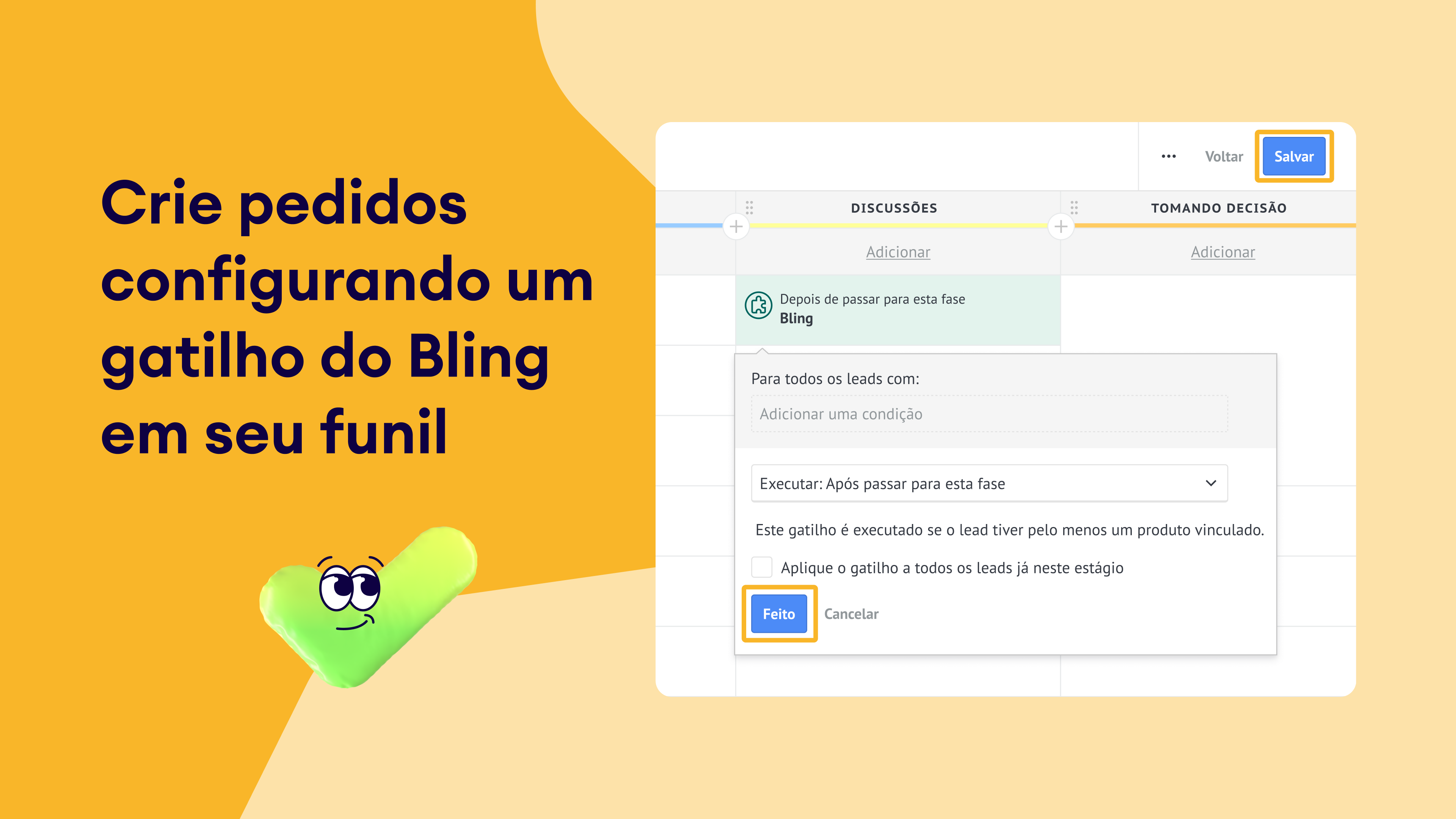 Automação baseada em gatilhos: Configure o gatilho do Bling no seu pipeline para criar pedidos automaticamente quando os leads atingirem os estágios designados.