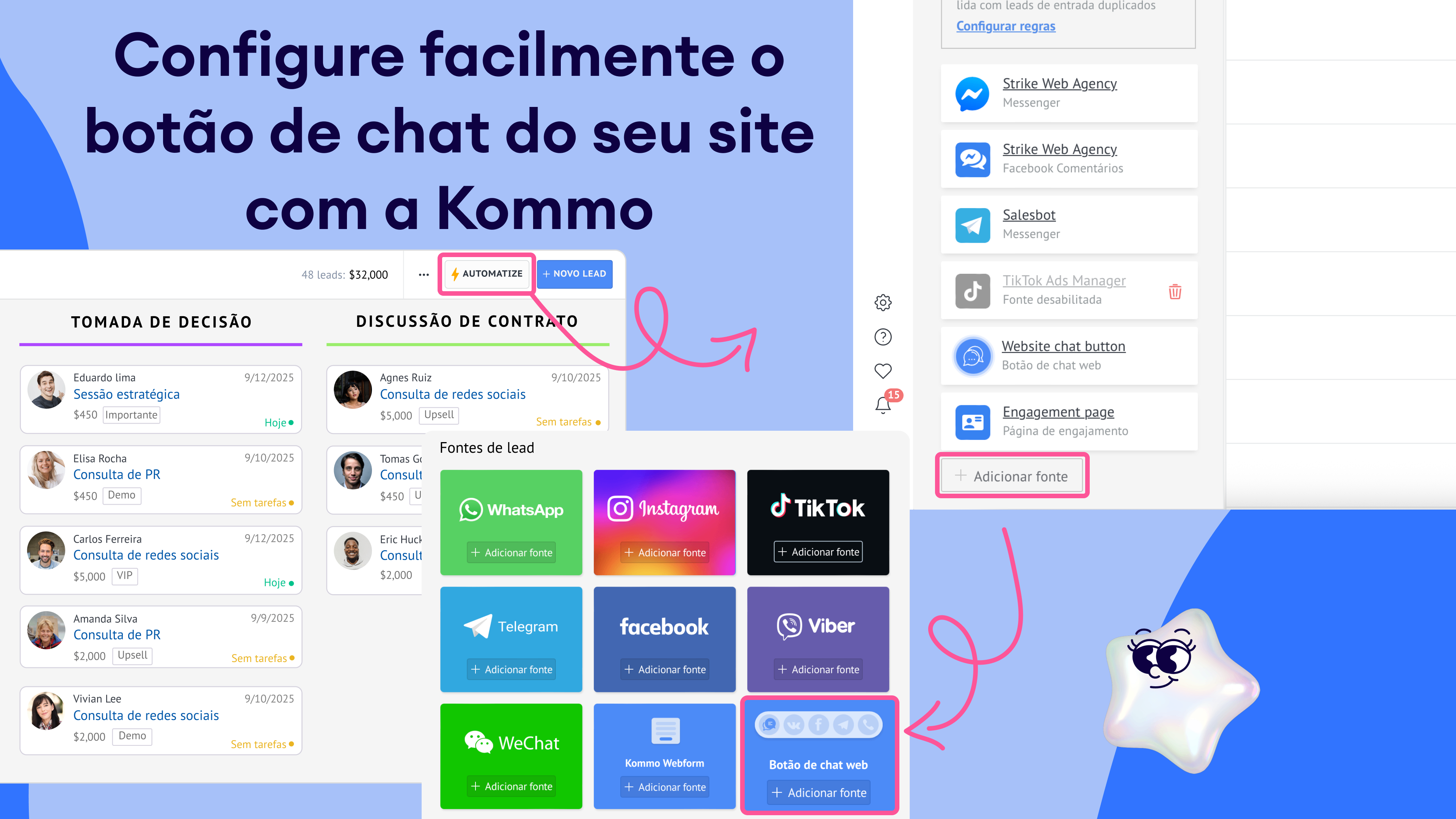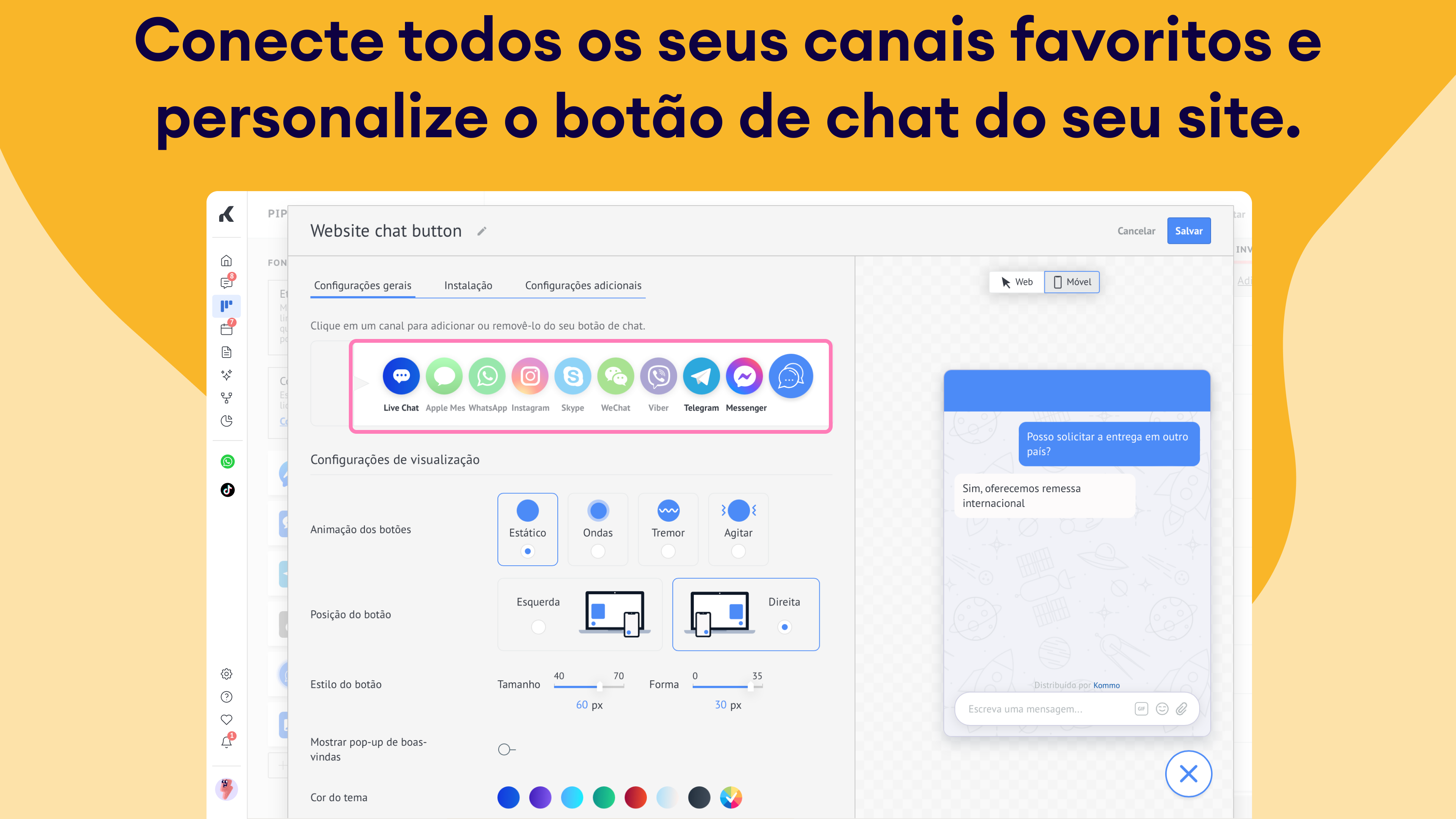 A integração com botão de chat para site permite que você se conecte com os visitantes no momento em que eles acessam seu site. Cada conversa se torna um lead na Kommo, permitindo que você acompanhe as interações, responda instantaneamente e permaneça conectado com clientes em potencial. Combinado com automação e chatbots, garante respostas rápidas e comunicação otimizada.