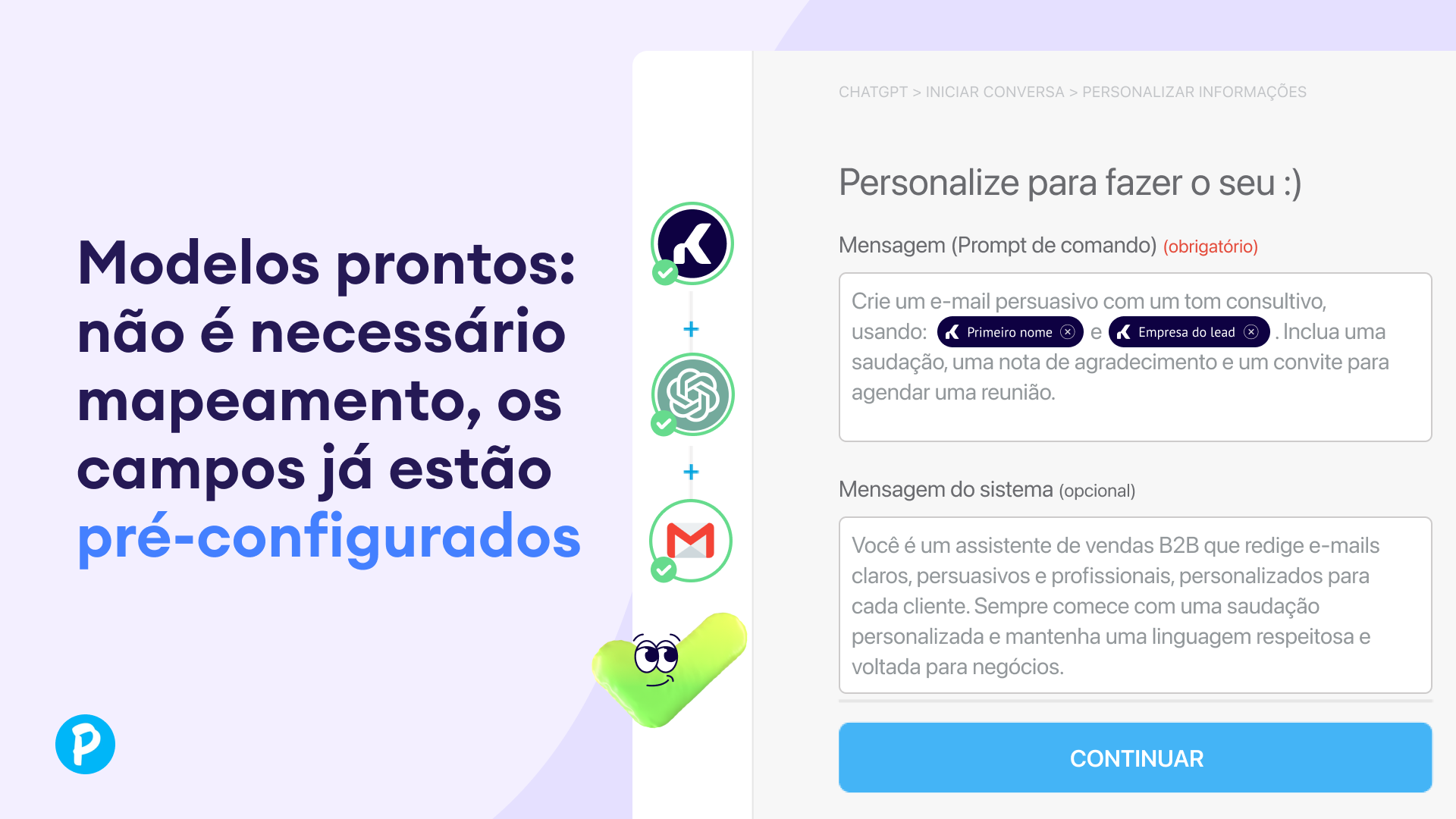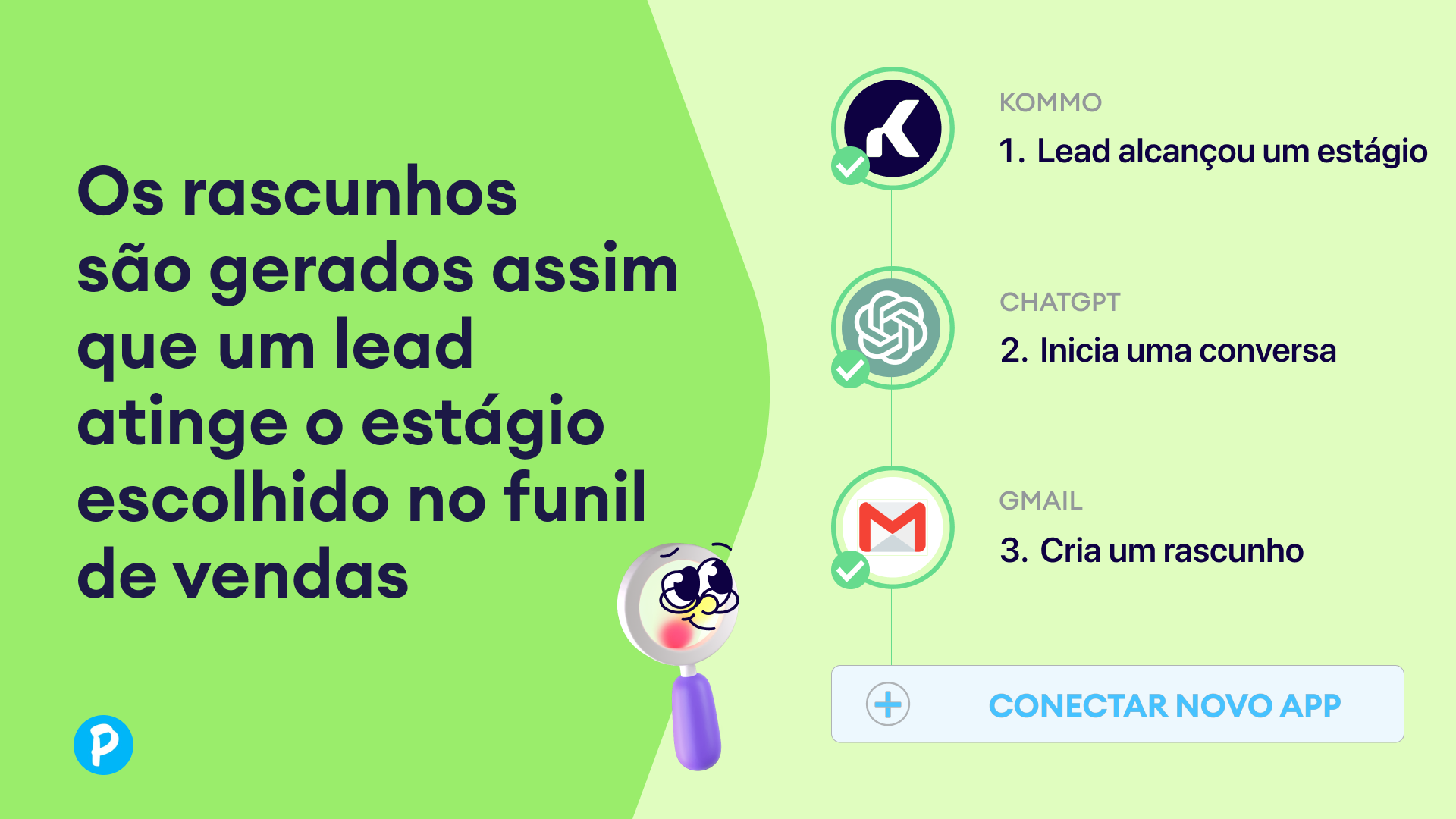 A integração do ChatGPT via Pluga adiciona uma camada de IA aos seus fluxos de trabalho do Kommo CRM. Ao conectar ambas as ferramentas por meio da plataforma de automação sem código da Pluga, você pode gerar automaticamente e-mails personalizados, classificar leads, extrair insights e conectar a Kommo a mais de 70 outras ferramentas. Essa conexão transforma a comunicação diária em ações inteligentes, orientadas por IA, que aumentam a produtividade e a consistência das mensagens.