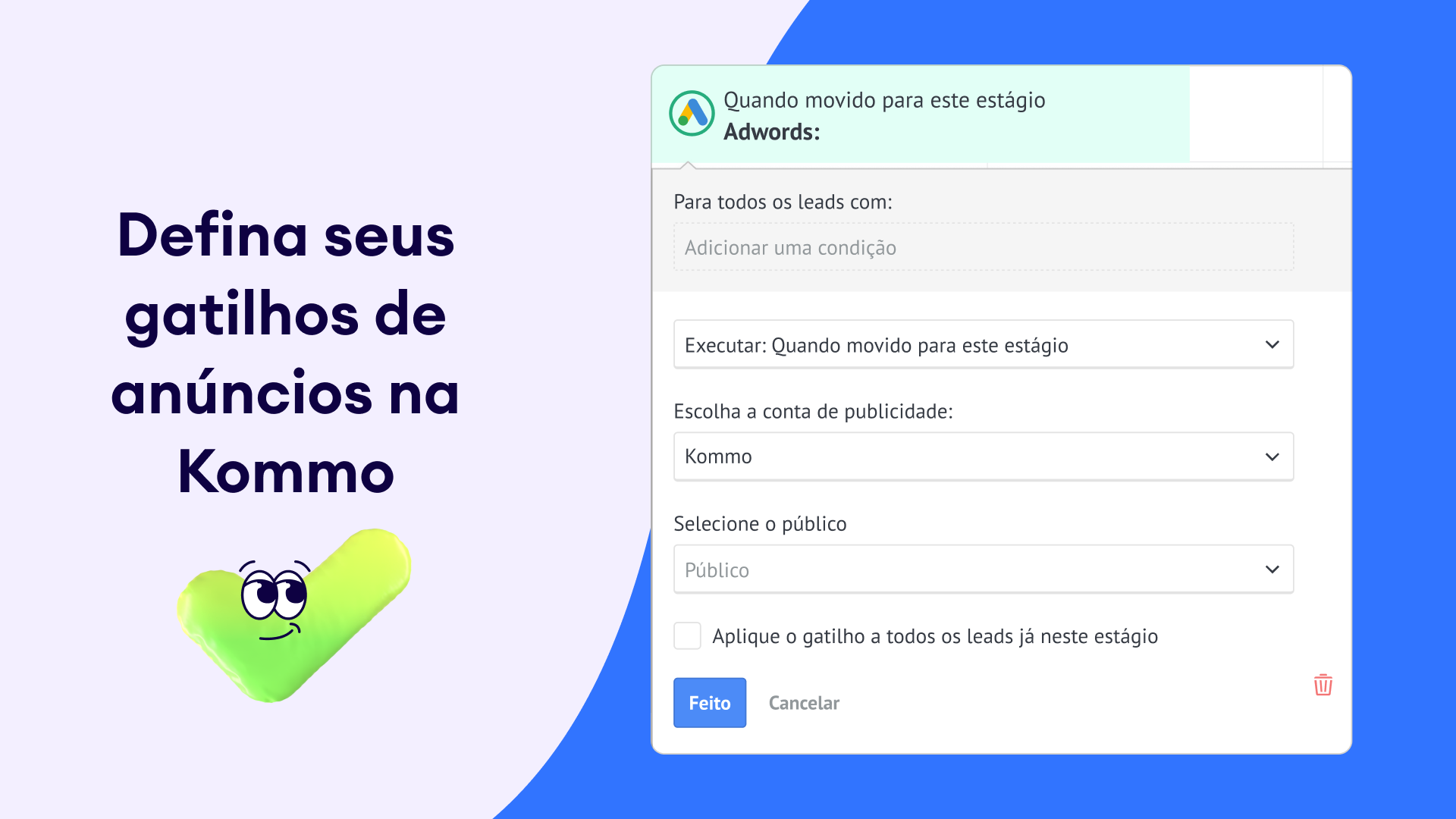Gerenciamento dinâmico de público: os leads são adicionados ao seu público do Google Ads quando entram em um estágio selecionado do funil e removidos ao saírem, mantendo uma lista de públicos atualizada.