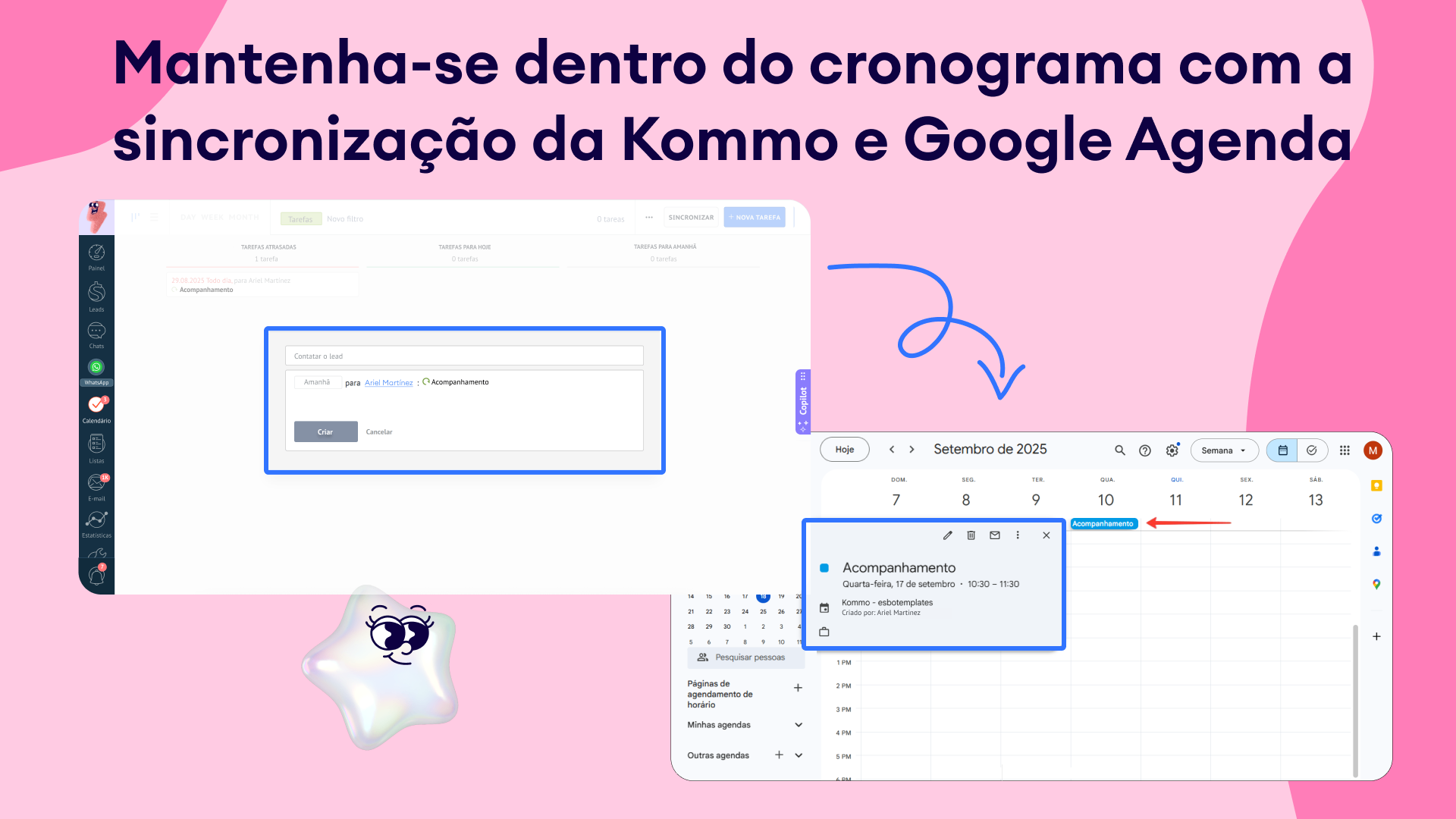 Sincronização bidirecional de tarefas e eventos: crie ou atualize tarefas no Kommo ou eventos no Google Agenda — tudo ficará perfeitamente sincronizado.