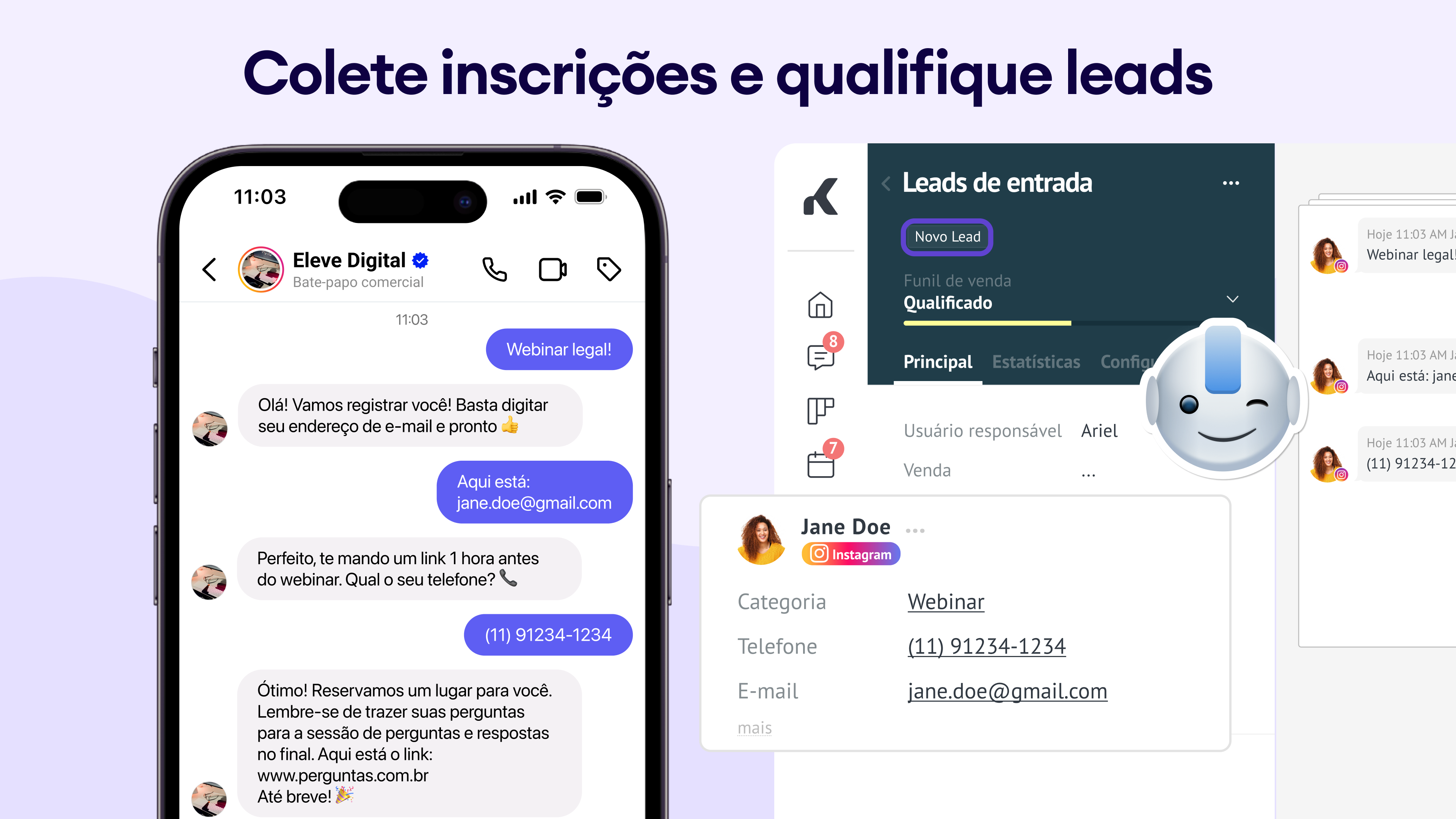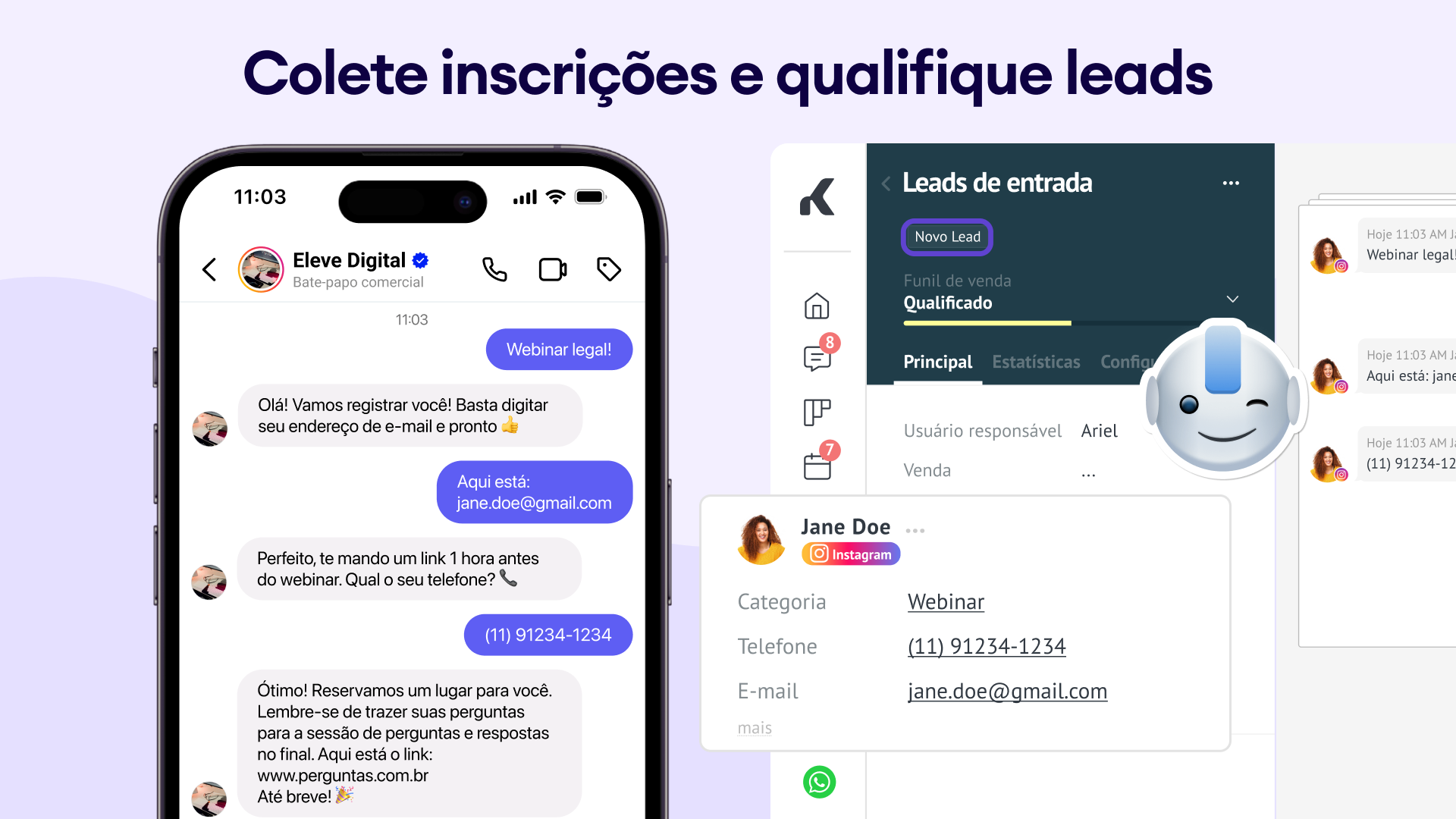 Captura e qualificação de leads: colete e-mails/telefones de mensagens diretas, comentários e histórias e qualifique leads na Kommo.