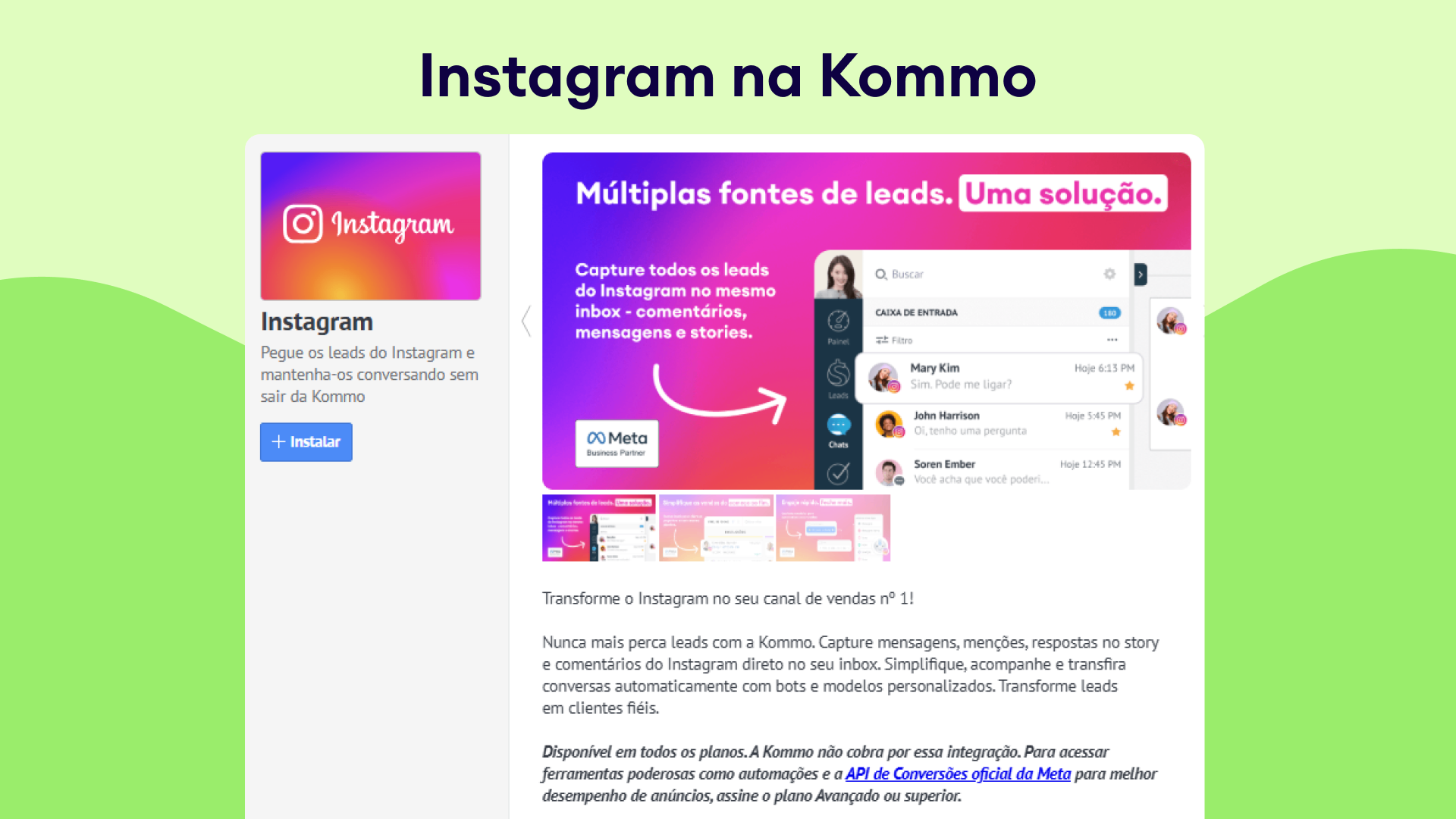 - Acesse o Marketplace na Kommo e encontre o Instagram.