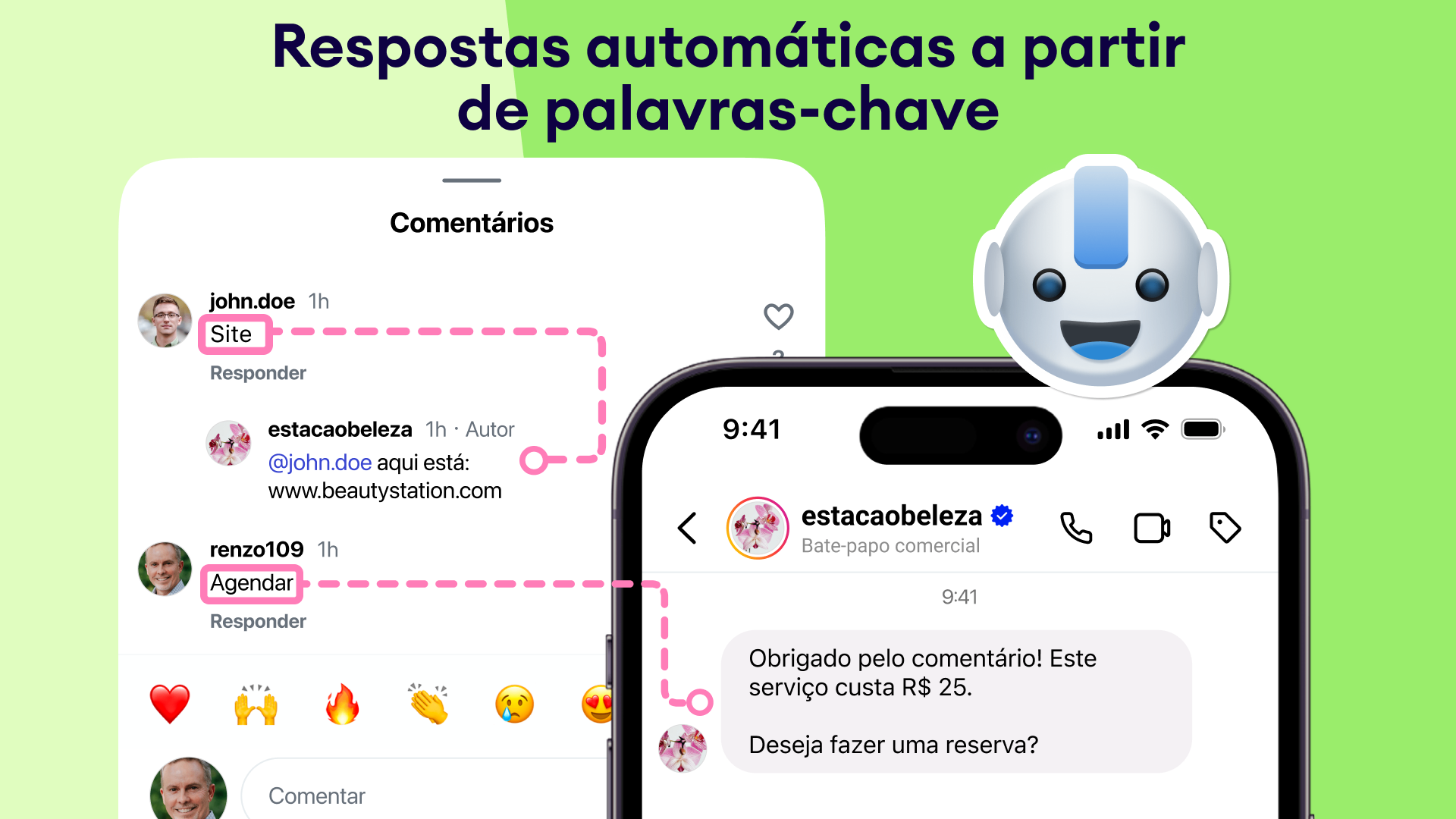 Roteamento de palavras-chave: responda automaticamente em comentários ou envie uma mensagem direta com base nas palavras-chave detectadas (por exemplo, “livro”, “site”).