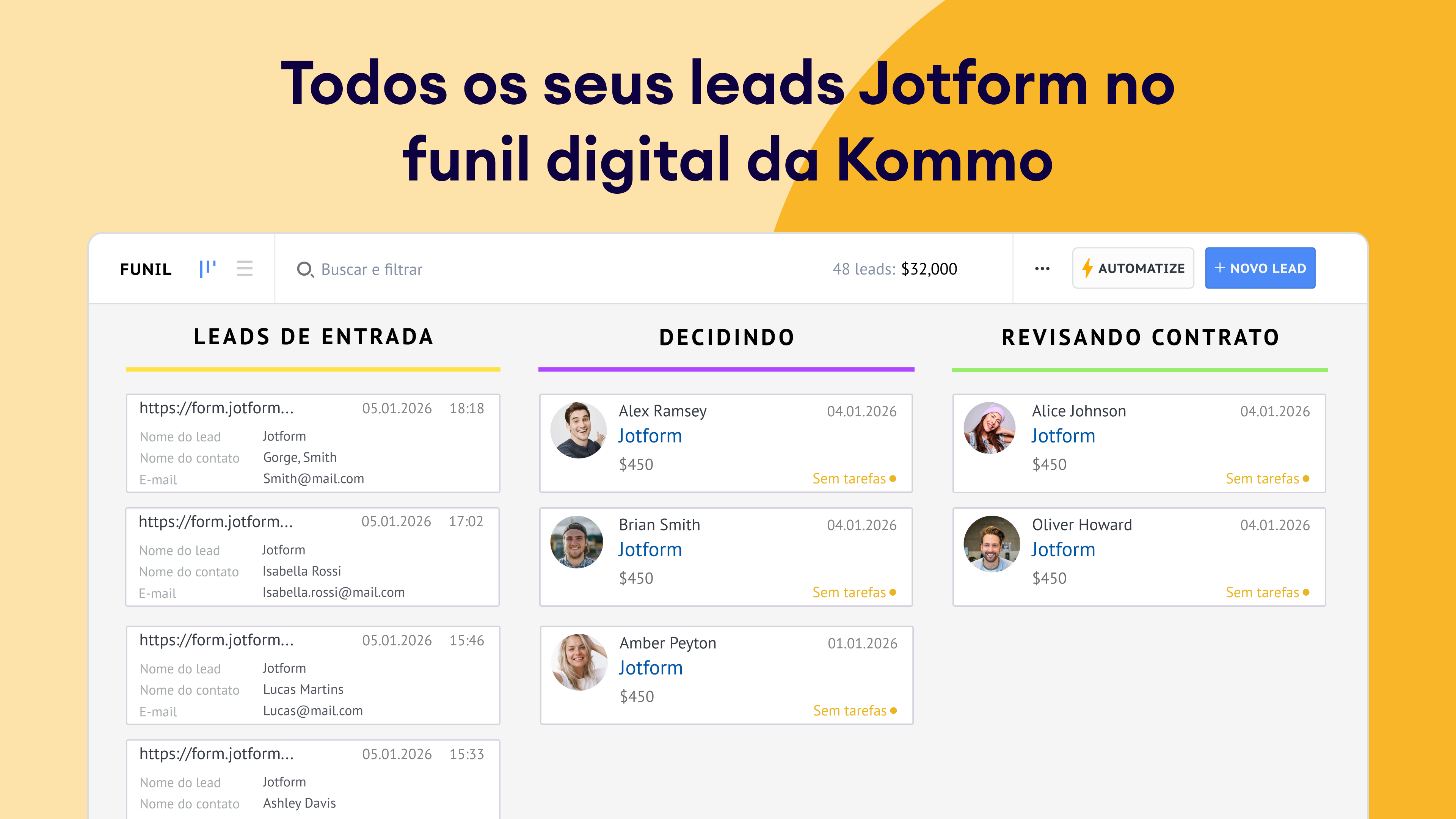Adicione novos leads automaticamente a Kommo: sempre que um JotForm é enviado, os dados são adicionados instantaneamente ao seu funil de vendas.