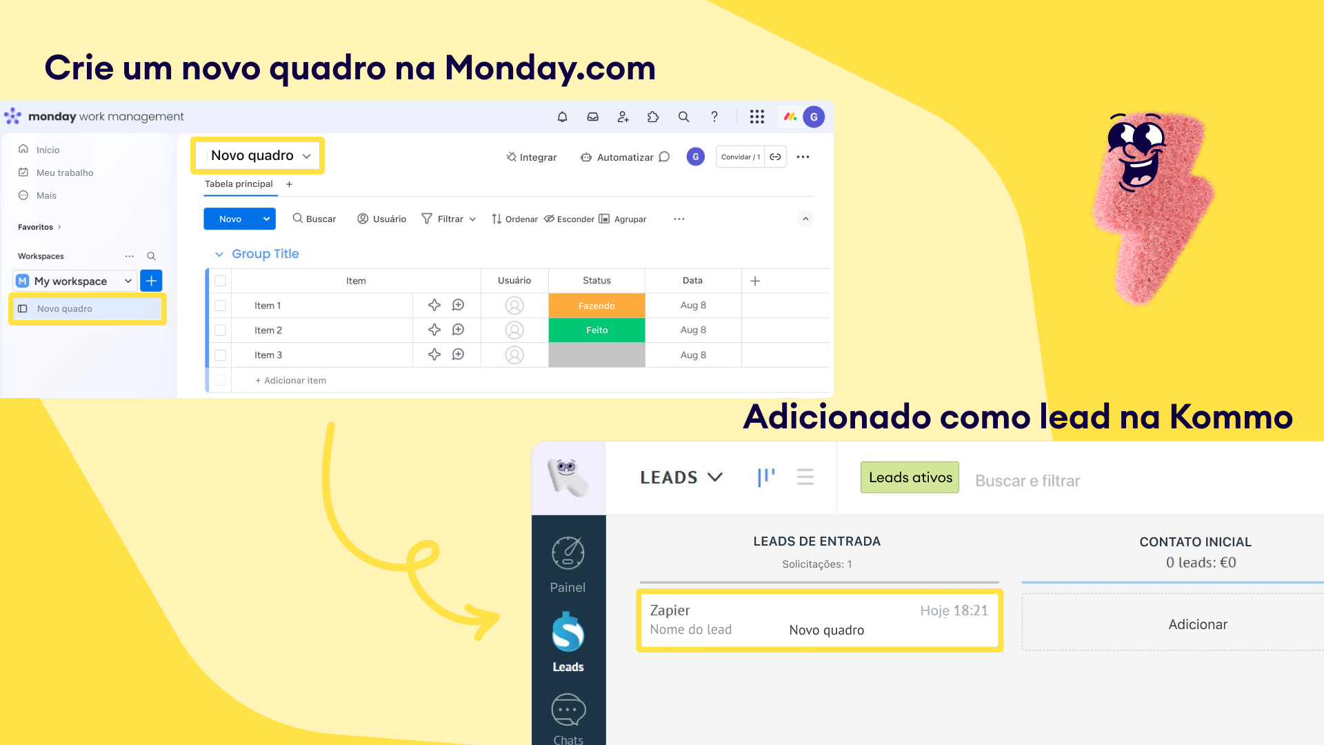 - Mapeie a atividade de leads da Kommo para os quadros e itens da Monday.