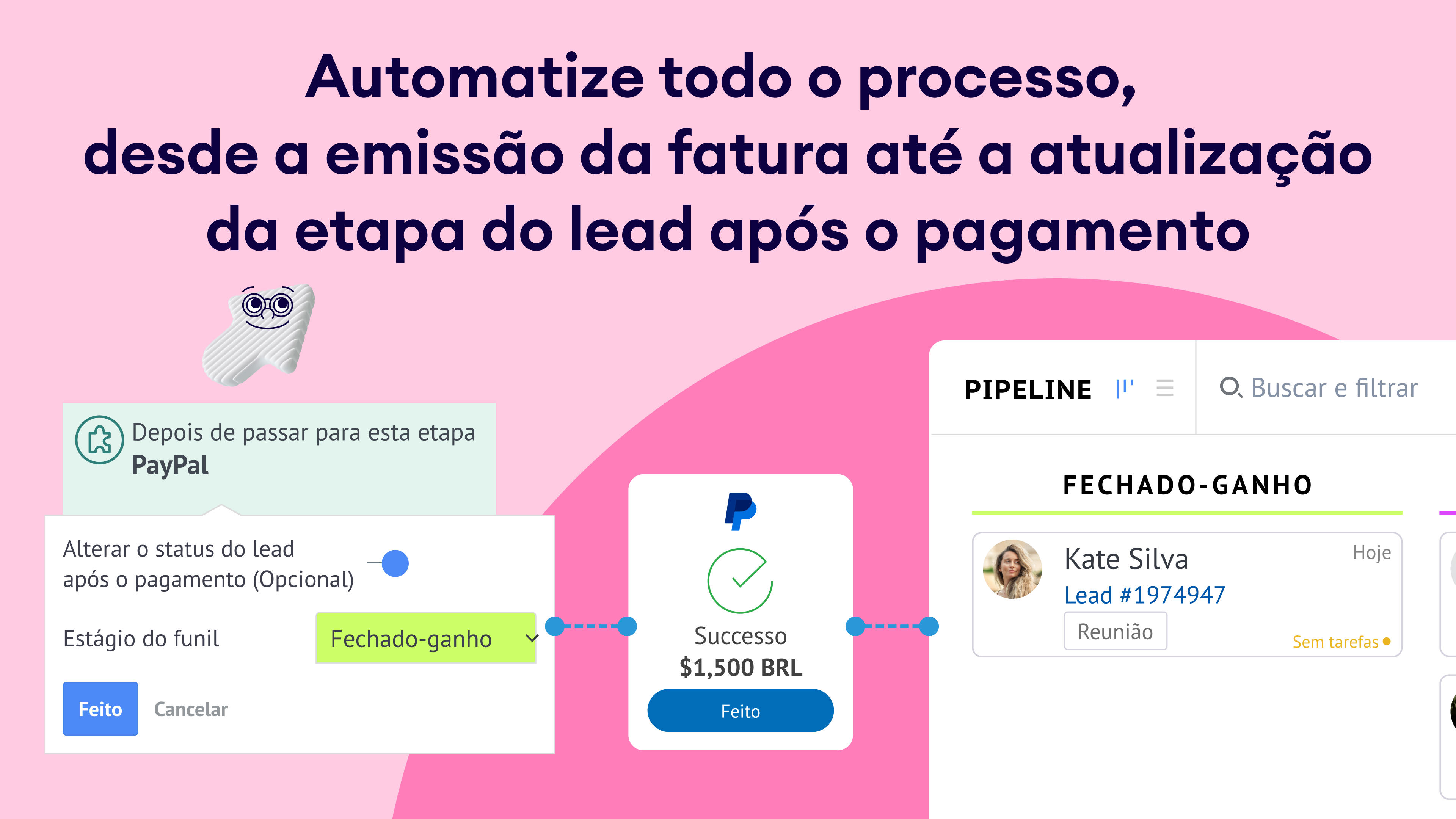 • Automação de funil: Simplifique seu processo de vendas movendo os leads automaticamente para a próxima etapa assim que o pagamento for recebido. Isso garante que seu funil reflita o progresso real da receita em tempo real.